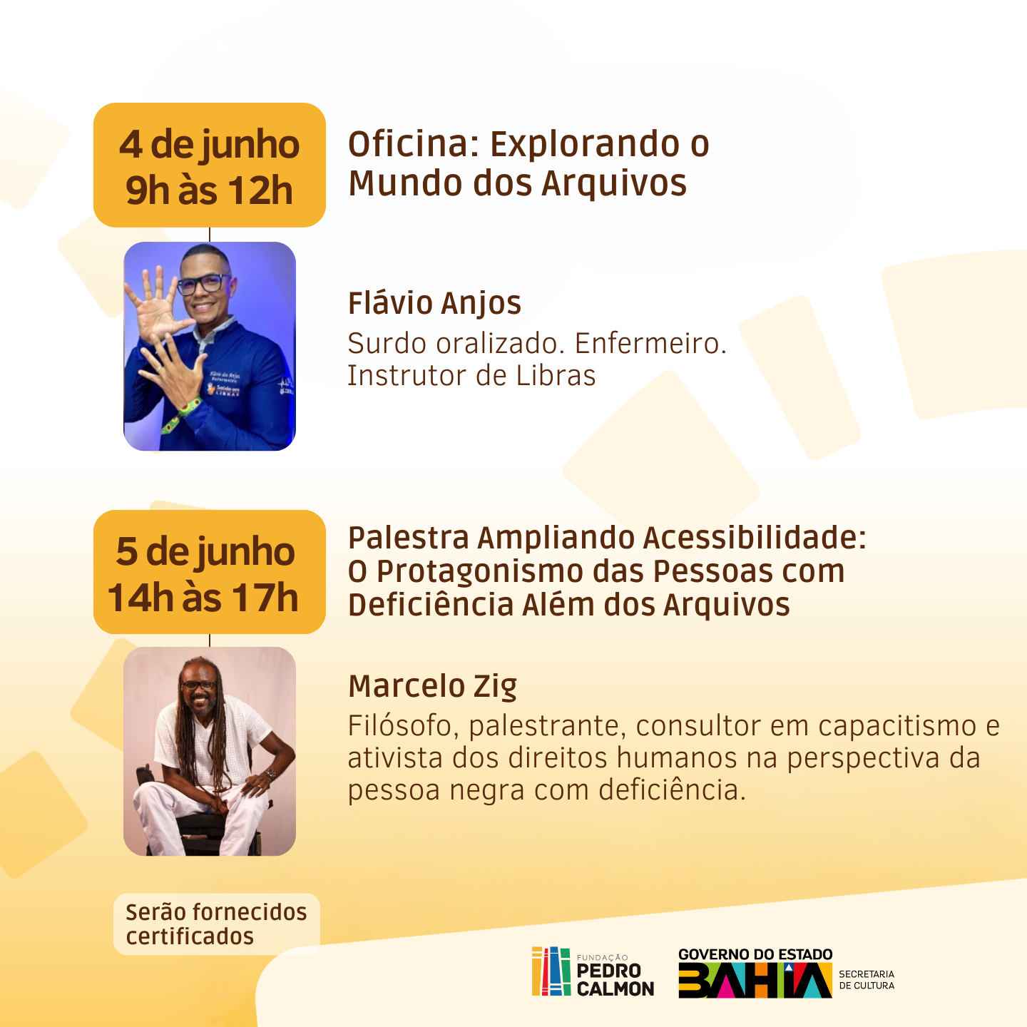 No dia 5 de junho, das 14h às 17h, acontece a Palestra ‘Ampliando Acessibilidade: O protagonismo das Pessoas com Deficiência Além dos Arquivos’, com a participação do palestrante, filósofo, consultor em capacitismo e ativista dos direitos humanos na perspectiva da pessoa negra com deficiência.