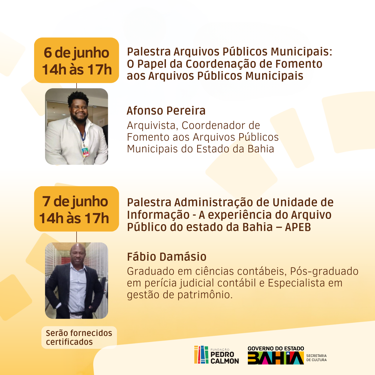 A Palestra ‘Arquivos Públicos Municipais: O Papel da Coordenação de Fomento aos Arquivos Públicos Municipais’ será no dia 06 de junho, das 14 às 17h, com a participação de Afonso Pereira, Arquivista e Coordenador de Fomento aos Arquivos Públicos Municipais do Estado da Bahia. Nesta palestra, será abordada a necessidade de uma articulação eficaz entre os arquivos municipais.