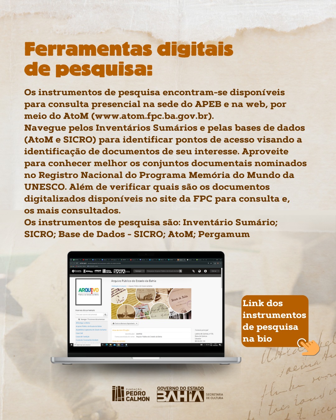 Ferramentas digitais de pesquisa O acervo custodiado encontra-se disponível também na web, por meio www.atom.fpc.ba.gov.br).  Atom “Acesso à Memória” oferece uma visão panorâmica do acervo e fornece informações gerais sobre os fundos tais como: título, nome e história de seu(s) produtor(es), datas-limite, dimensões, gêneros documentais, conteúdo dos documentos, sistema de organização e condições de acesso.