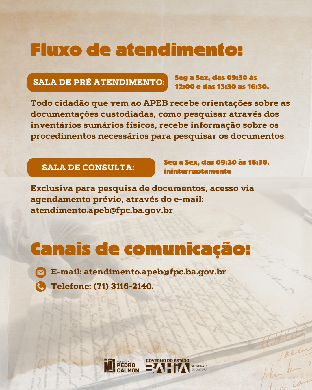A Sala de consulta é exclusiva para pesquisa de documentos, e podem ser acessadas via agendamento prévio, através do e-mail: atendimento.apeb@fpc.ba.gov.br, ou telefone: (71) 3116-2140.
