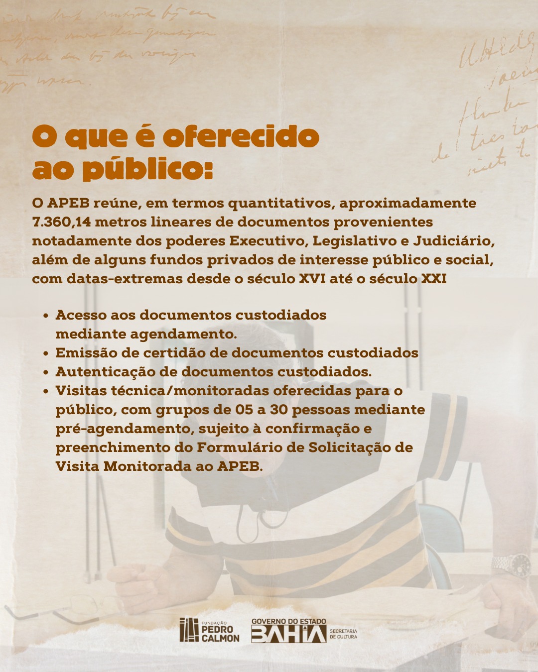 Na instituição, o público pode ter acesso aos documentos custodiados, assim como emissão de certidão e autenticação dos mesmos, além de visitas técnica oferecidas ao público, com grupos de 05 a 30 pessoas mediante pré-agendamento.