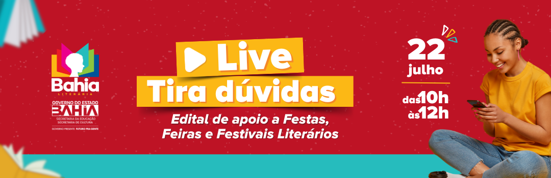 Na próxima segunda-feira (22), das 10h às 12h, a Fundação Pedro Calmon, unidade vinculada à Secretaria de Cultura da Bahia (SecultBa), promove a Live Tira Dúvidas sobre o Edital de Apoio a Festas, Feiras e Festivais Literários que está com inscrições abertas até 31 de julho. A transmissão será pelo canal do YouTube fpedrocalmon.