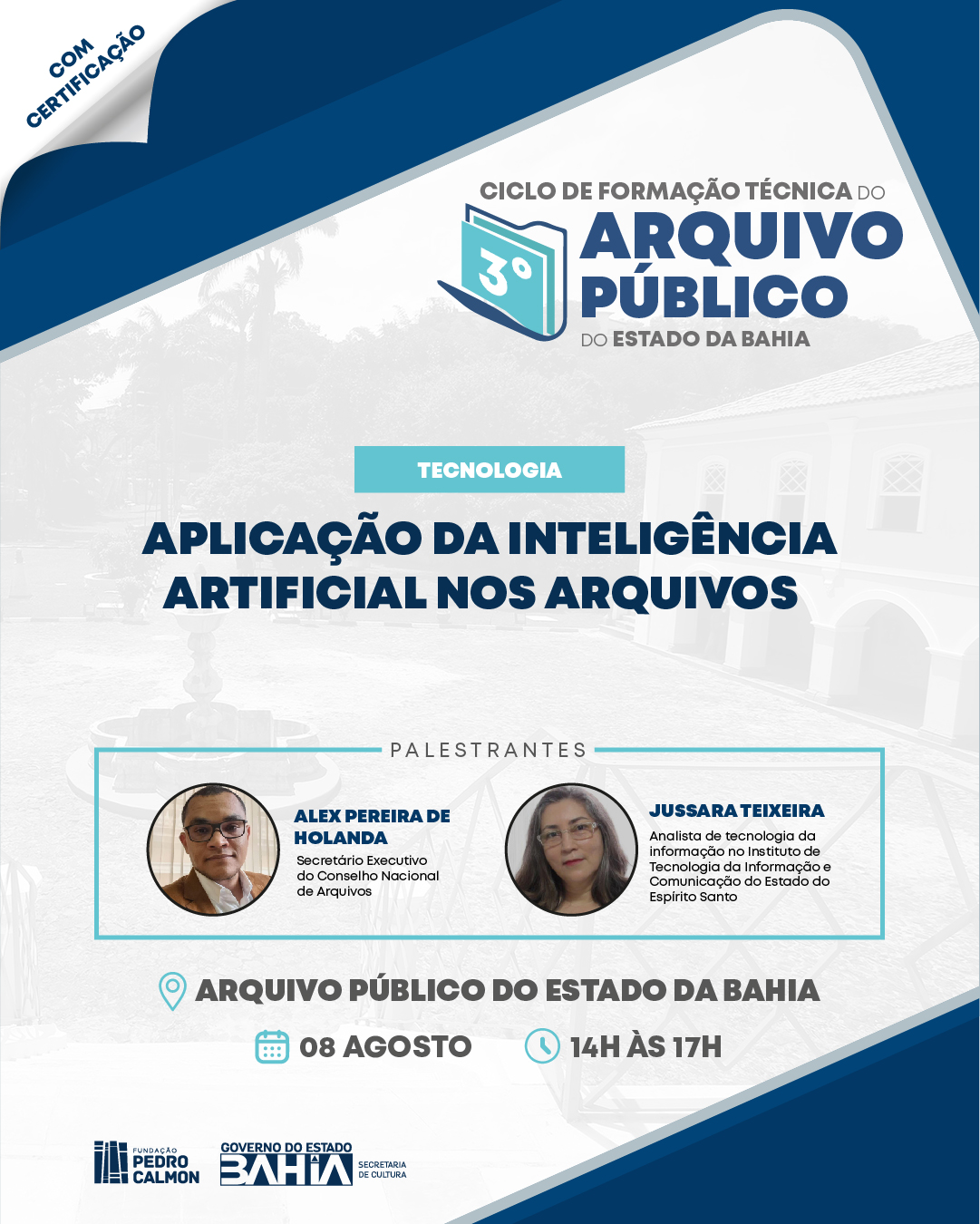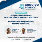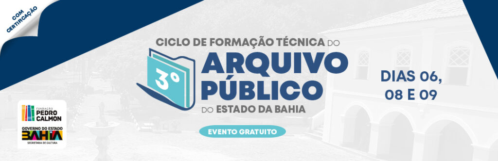 Aberto ao público em geral, tem início nesta terça-feira (06) o 3° Ciclo de Formação Técnica do Arquivo Público da Bahia (APEB), unidade vinculada à Fundação Pedro Calmon (FPC/SecultBA). A formação conta com a participação dos palestrantes Alex Pereira de Holanda (Secretário Executivo do Conselho Nacional de Arquivos), Bruno César de Carvalho Coelho (Tabelião e Registrador Civil em São Sebastião do Passé/BA), Jussara Teixeira (Analista de Tecnologia da Informação no Instituto de Tecnologia da Informação e Comunicação do Estado do Espírito Santo – Prodest), e Jorge Vieira (Diretor do Arquivo Público do Estado da Bahia).