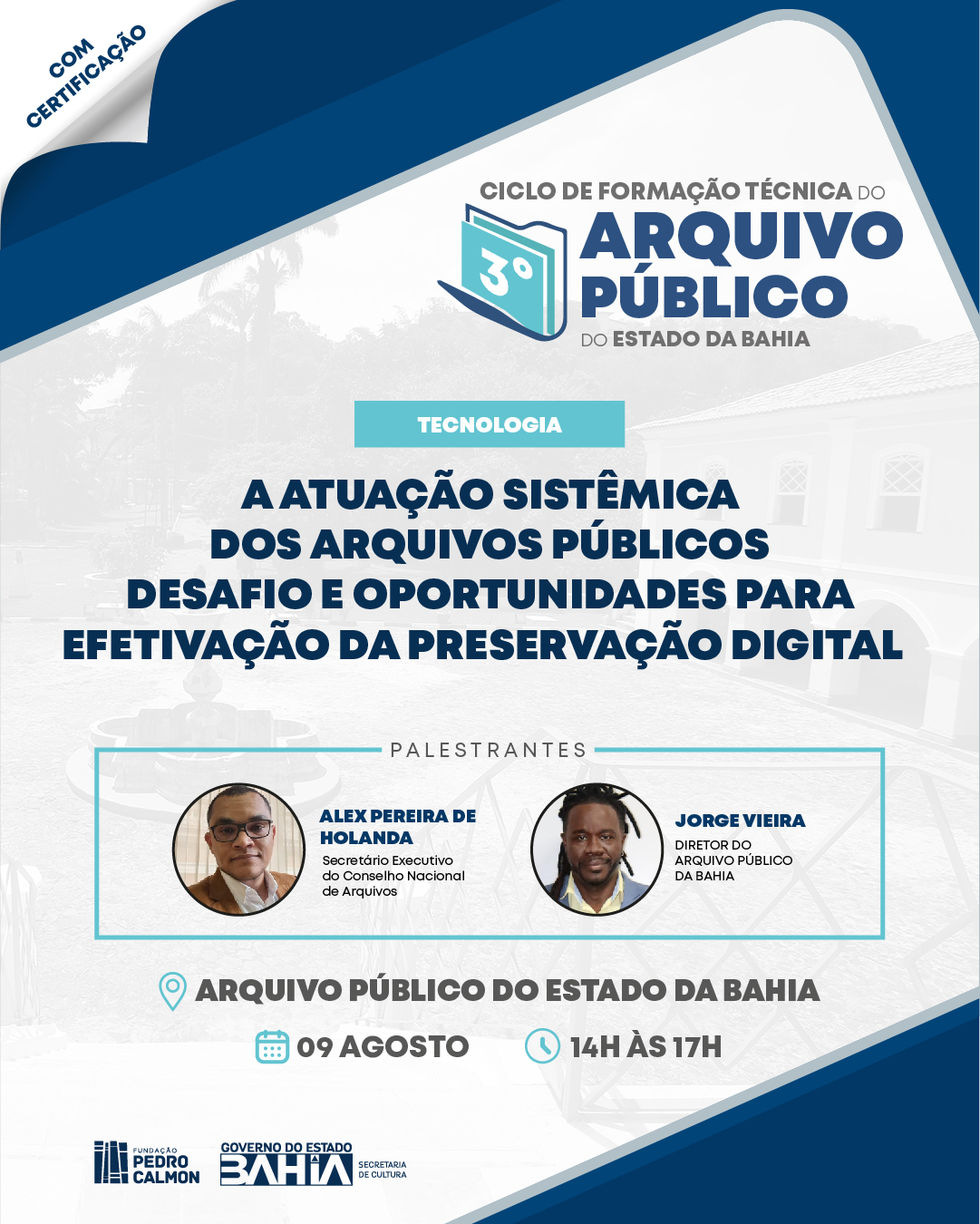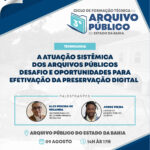 Encerrando este 3° ciclo de formação, “Atuação Sistêmica dos Arquivos Públicos desafio e oportunidades para efetivação da preservação digital” será abordada na mesa conduzida por Alex Pereira de Holanda e Jorge Vieira, sexta-feira (09/08), das 9h30 às 11h30h.