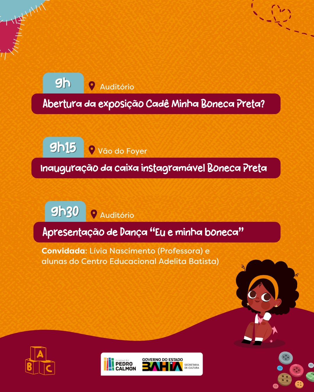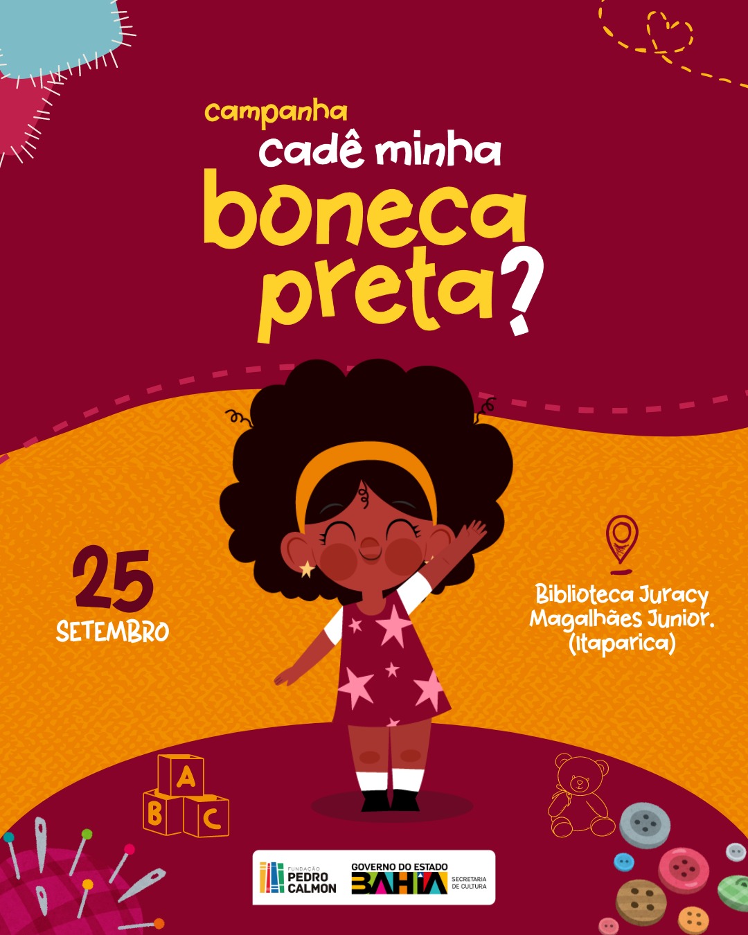Diversidade cultural e representatividade importam, e muito! Promover o sentimento de pertencimento, o reconhecimento dos traços identitários e da autoestima, esses são alguns dos objetivos da Campanha “Cadê minha boneca preta?”, uma realização da Secretaria de Cultura do Estado da Bahia, por meio da Fundação Pedro Calmon e executado pela Biblioteca Juracy Magalhães Júnior – Itaparica. Mais uma edição do projeto que doa bonecas pretas às crianças em situação de vulnerabilidade social, foi lançada no dia 25 de setembro.