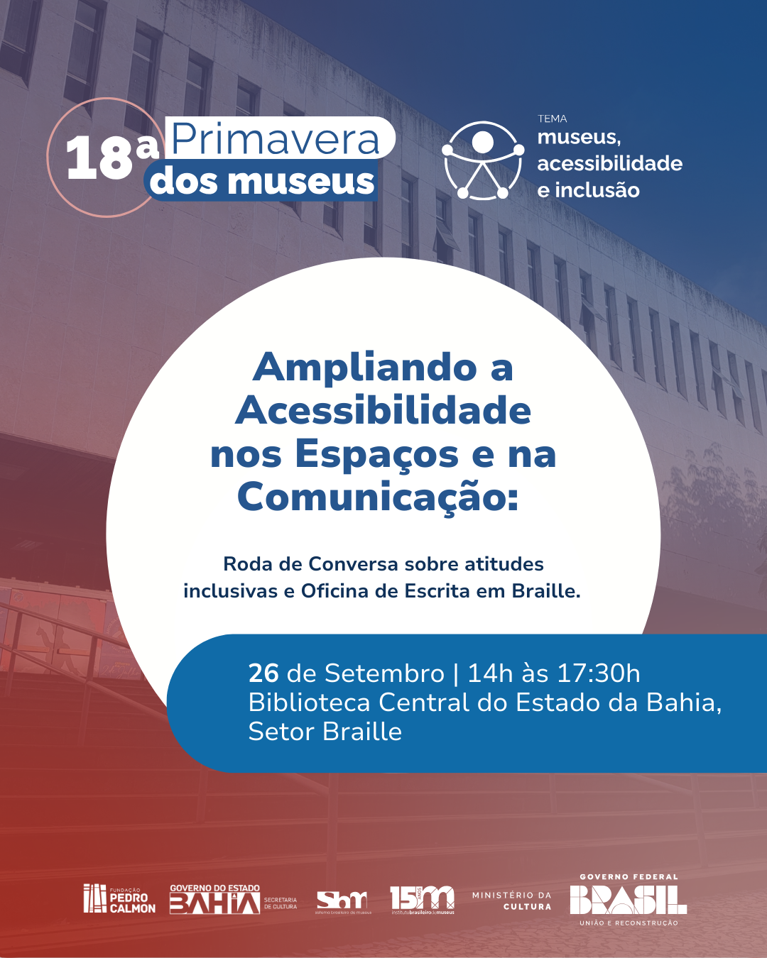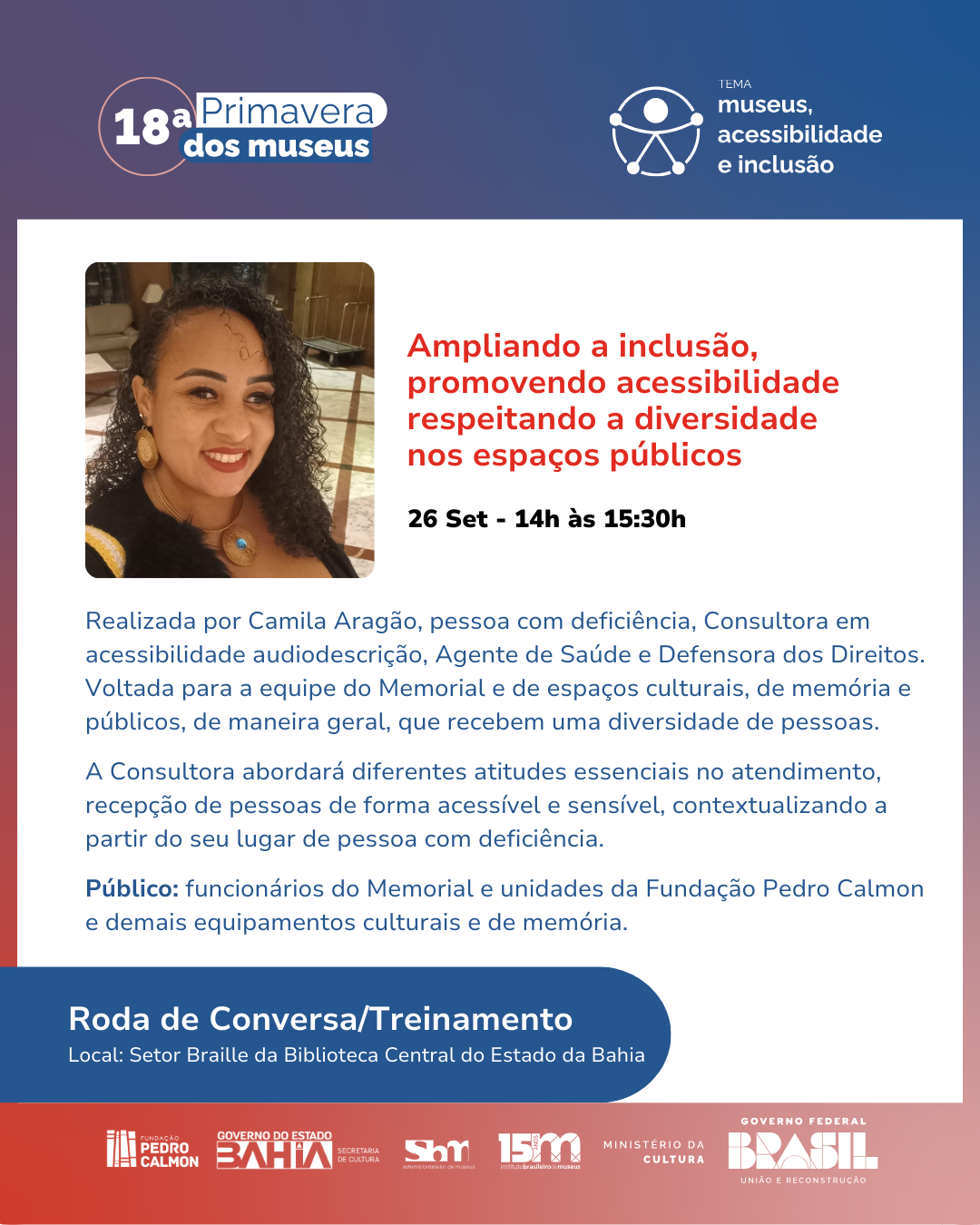 No dia 26/09, das 14h às 17h30, a Biblioteca Central do Estado da Bahia, promove a Roda de Conversa/Treinamento: “Ampliando a inclusão, promovendo acessibilidade respeitando a diversidade nos espaços públicos”. Ministrada por Camila Aragão, consultora em acessibilidade e audiodescrição, a conversa é voltada para funcionários do Memorial e espaços culturais, abordando atitudes essenciais no atendimento acessível.