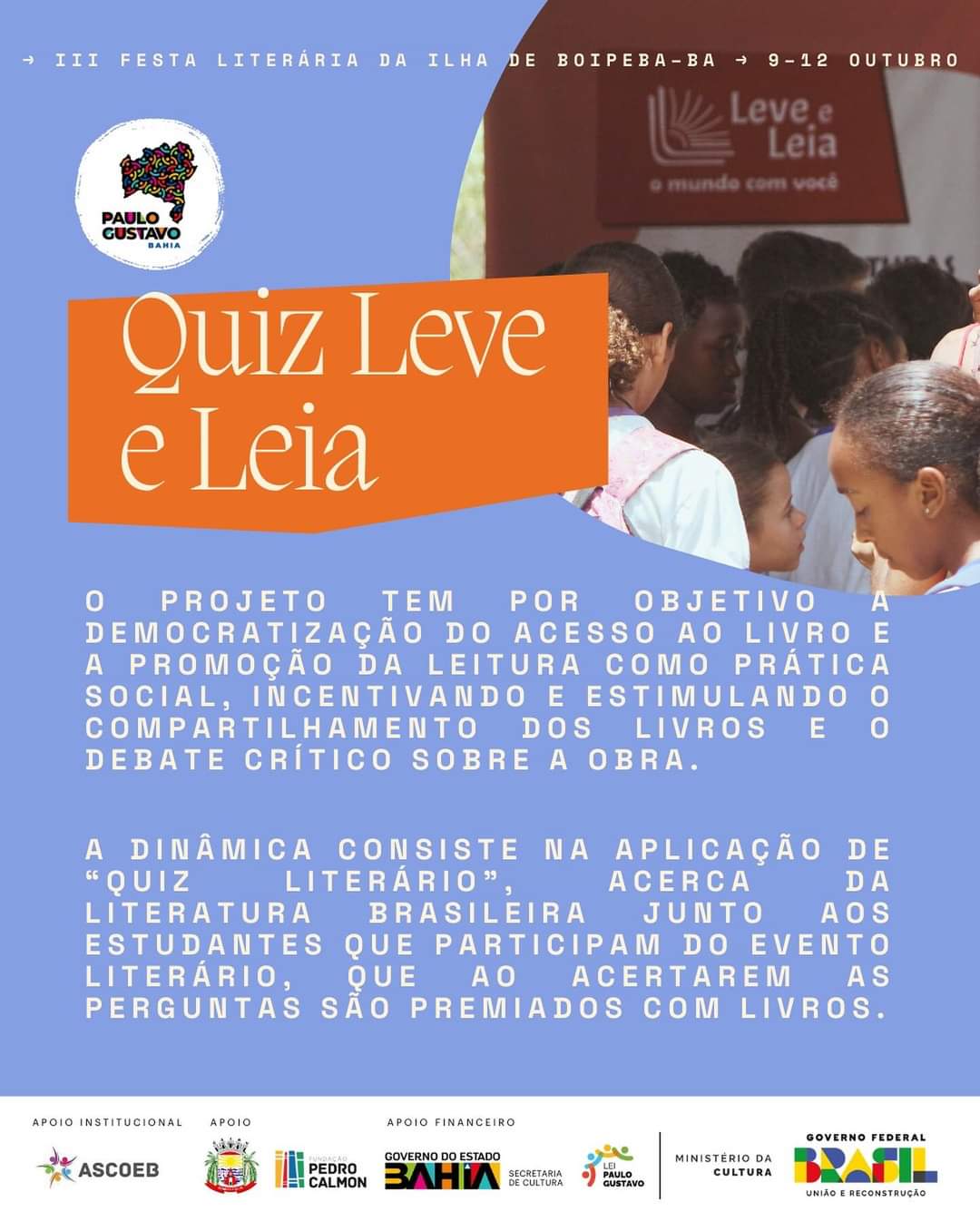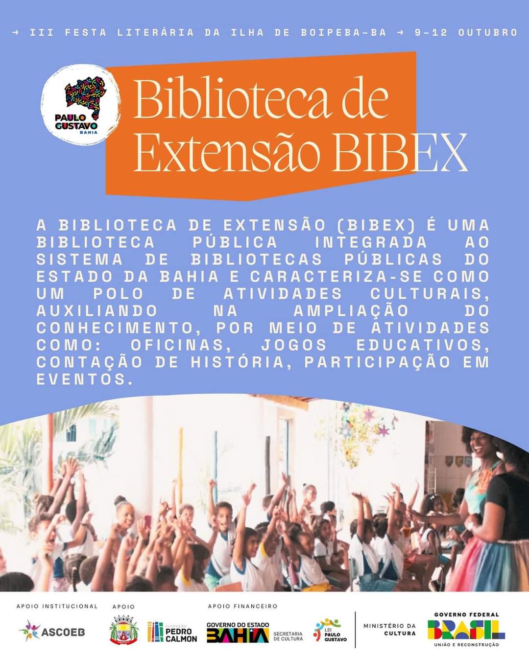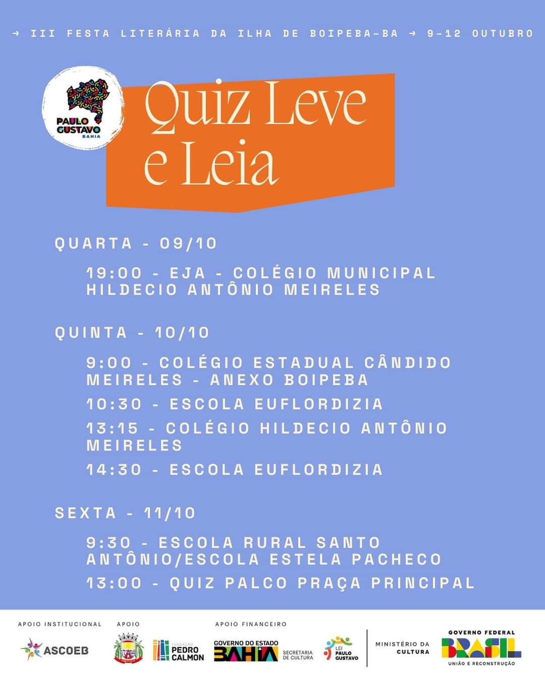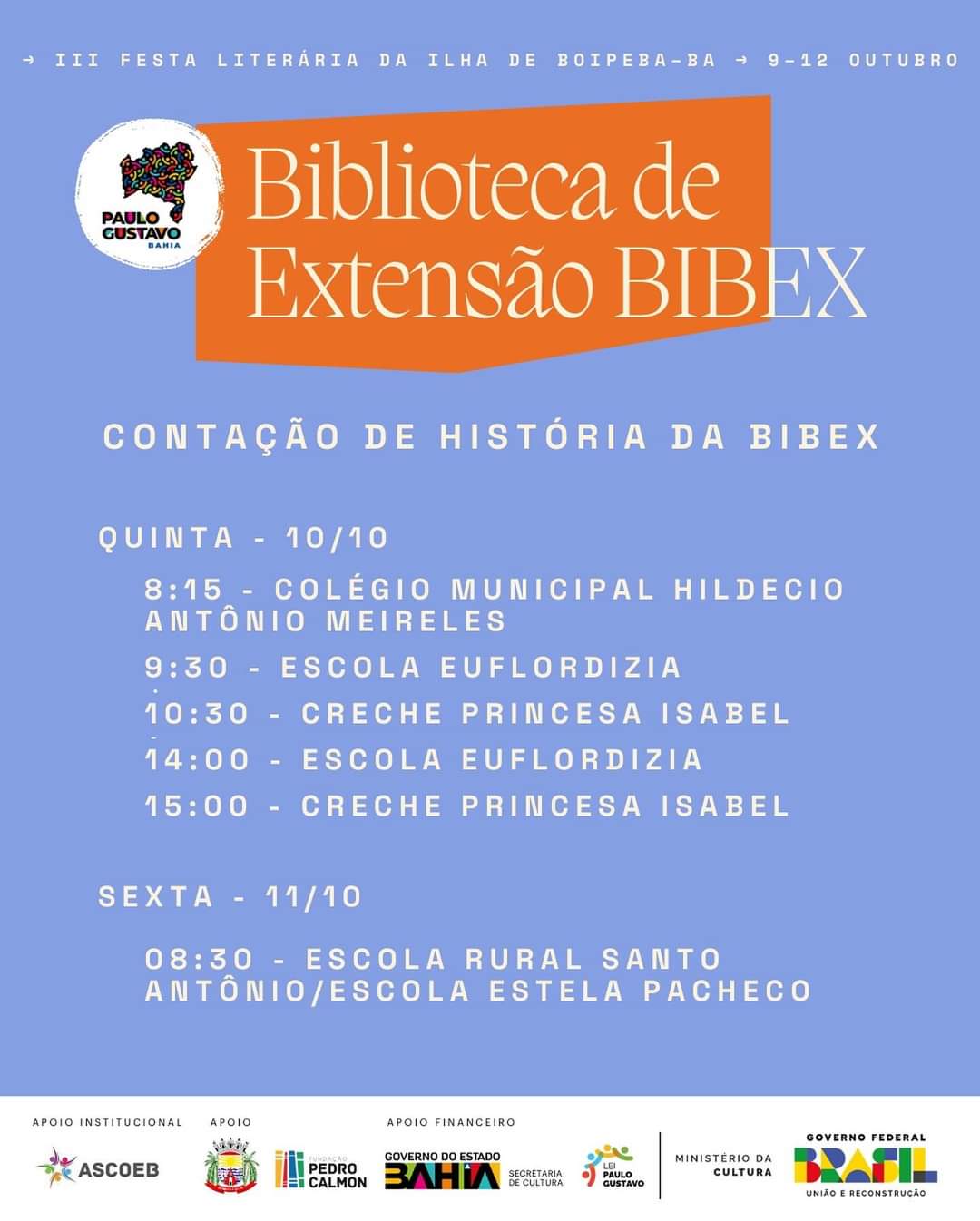 “Essa edição da FLIPEBA é a consolidação do trabalho de 3 anos que articulou a comunidade local, instituições públicas, a escola, artistas de diferentes áreas, o turismo e o comércio”, afirma Gilvan Reis, um dos coordenadores do evento. “É uma enorme alegria e um momento de celebração colocar a Festa na rua, mobilizando uma enorme rede na ilha em prol da educação e da cultura", destaca.