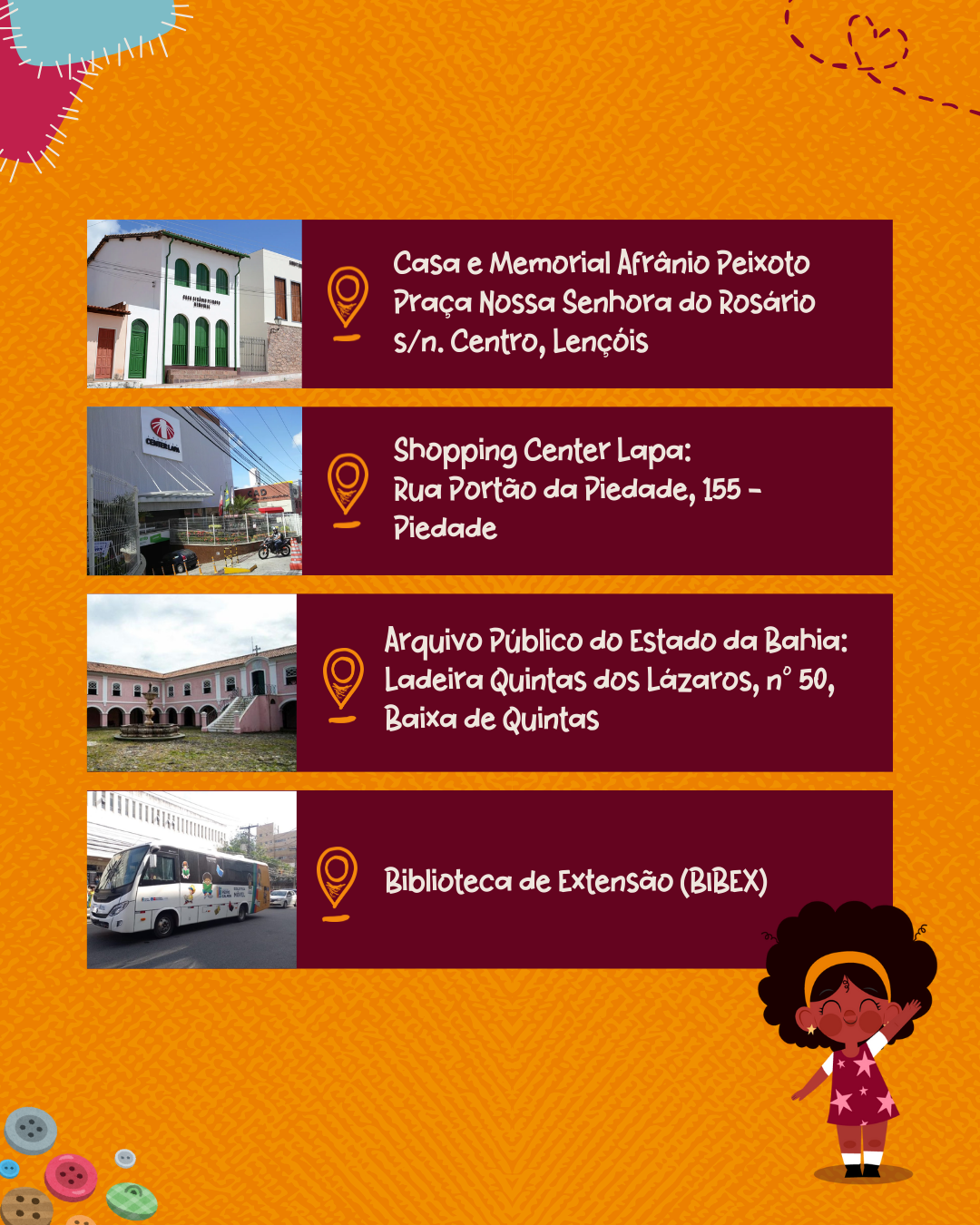 A arrecadação dos brinquedos será até dia 06 de novembro. O evento de entrega das bonecas acontecerá no dia 07 de novembro, com programação cultural e educativa com as crianças.