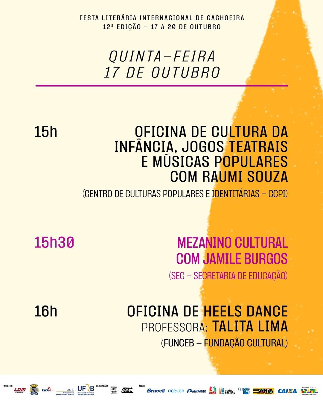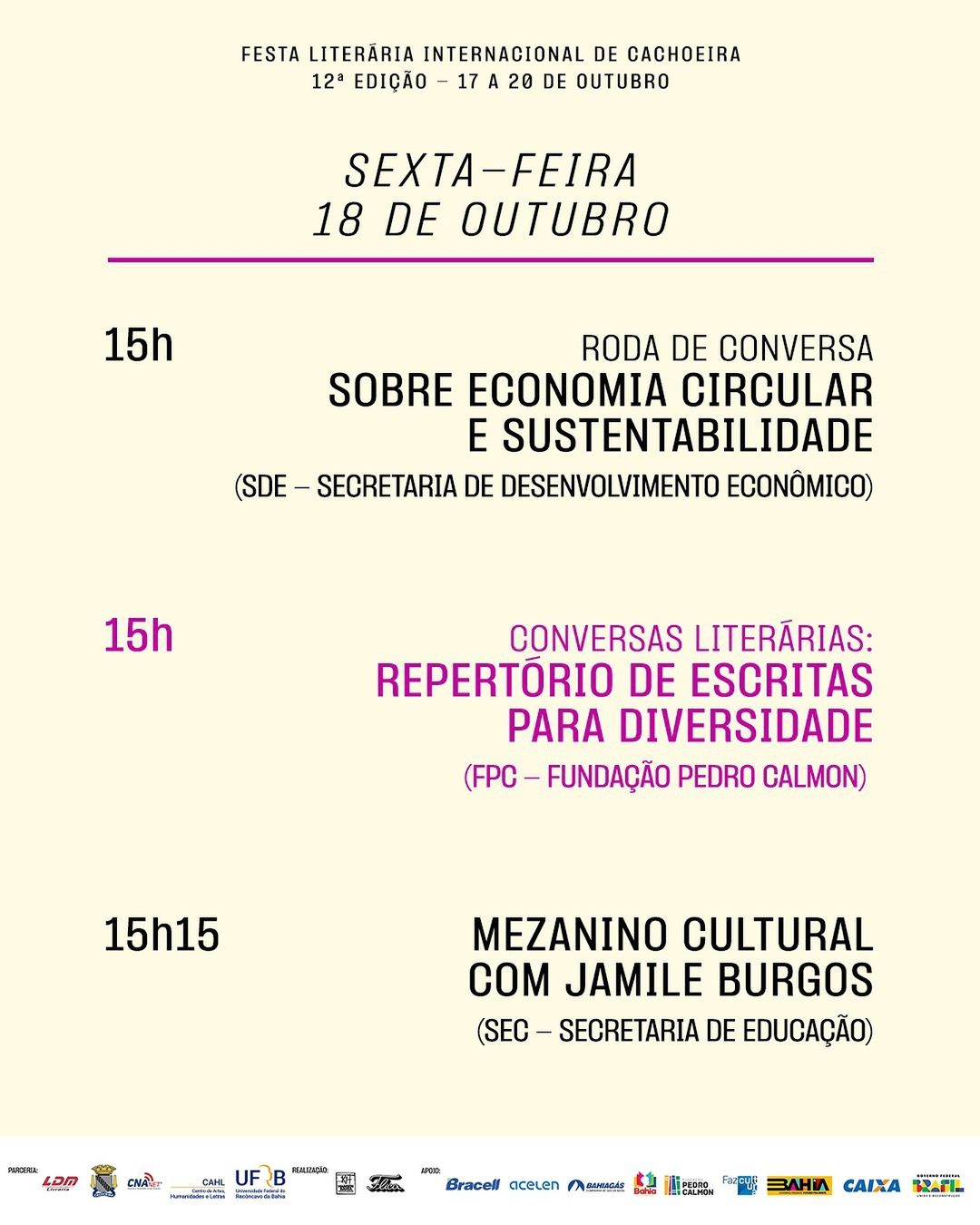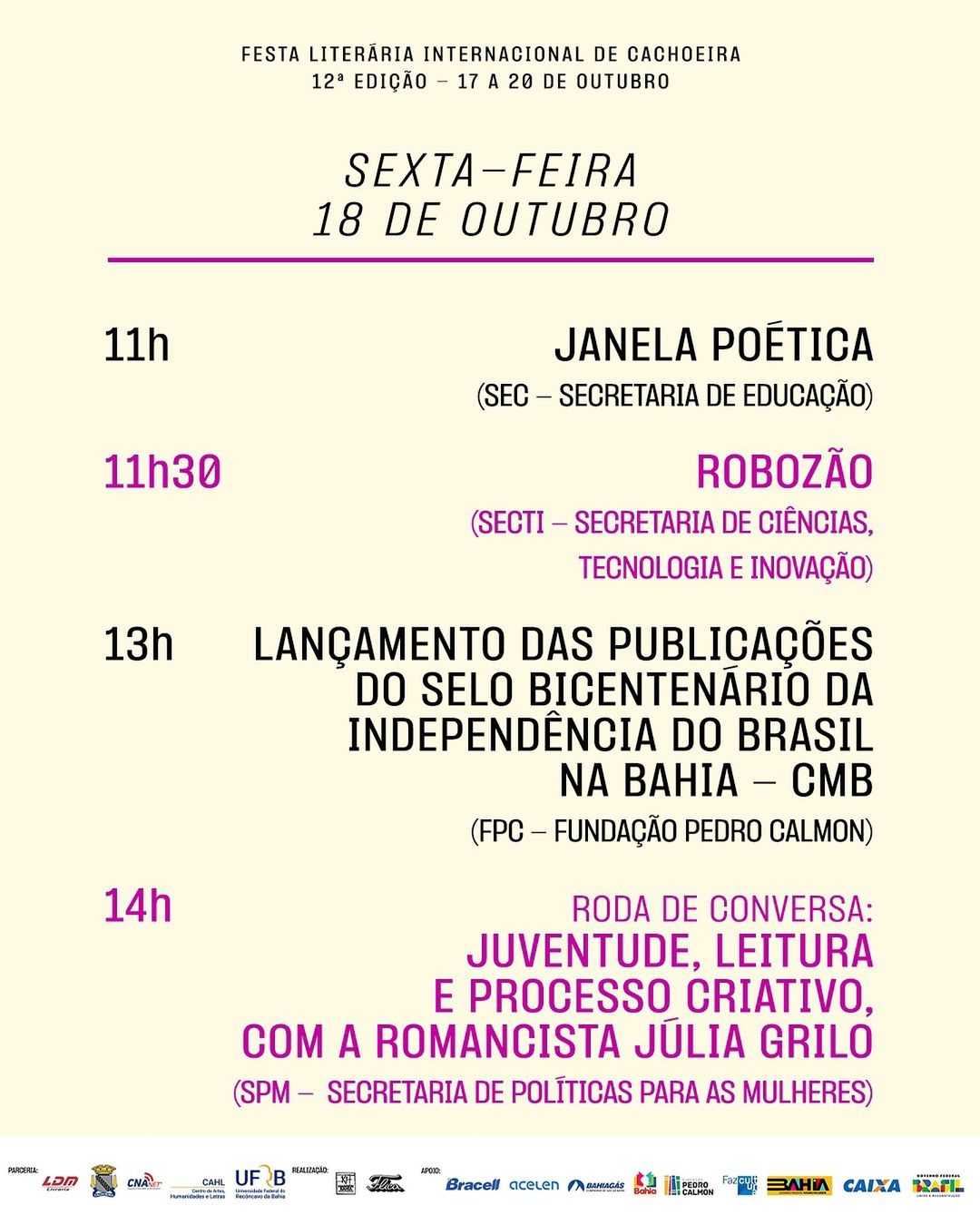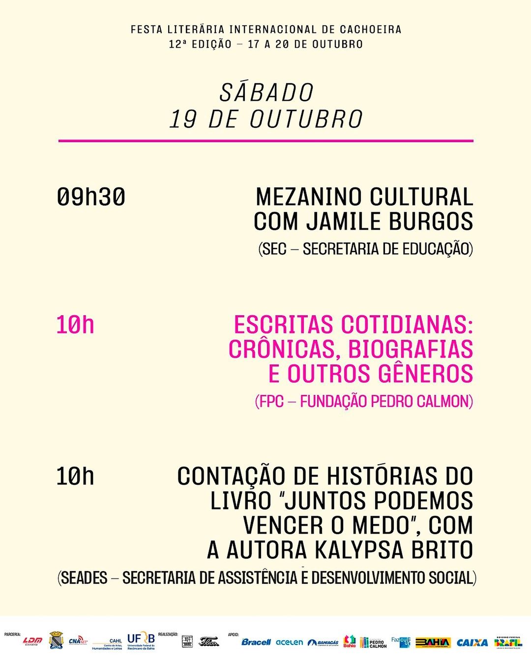 Com o tema “O mundo da literatura em festa”, a 12° Feira Literária Internacional de Cachoeira (FLICA), promete ser mais uma grande celebração da cultura, arte e educação, com uma programação diversa e que irá transformar o Recôncavo Baiano no palco da maior festa literária do Norte/Nordeste. A FLICA tem apoio do Governo da Bahia, que assim como no ano passado, reúne atividades dos órgãos e secretarias estaduais na Casa do Governo, localizada na Fundação Hansen Bahia, durante os dias do evento, que acontece entre 17 a 20 de outubro.