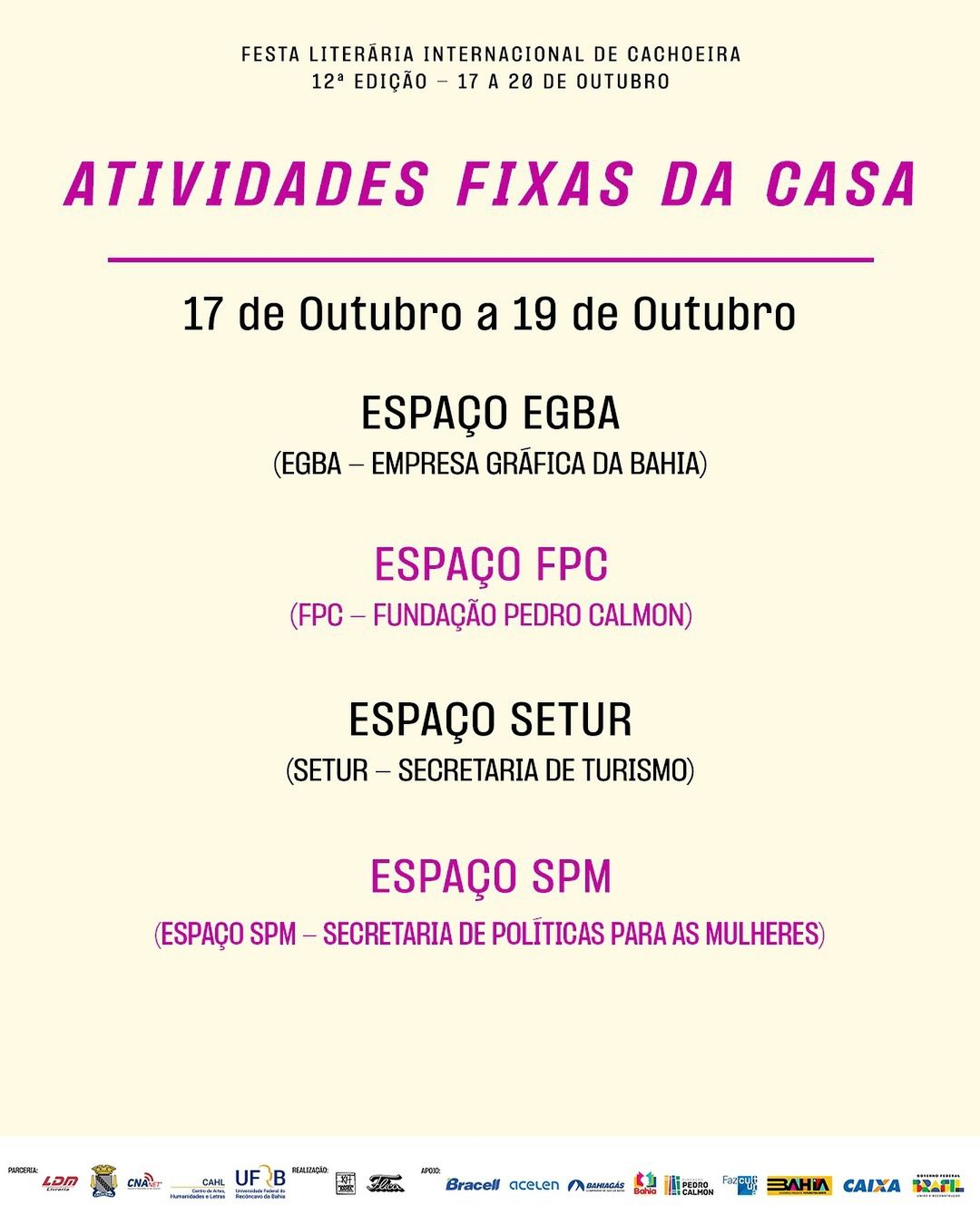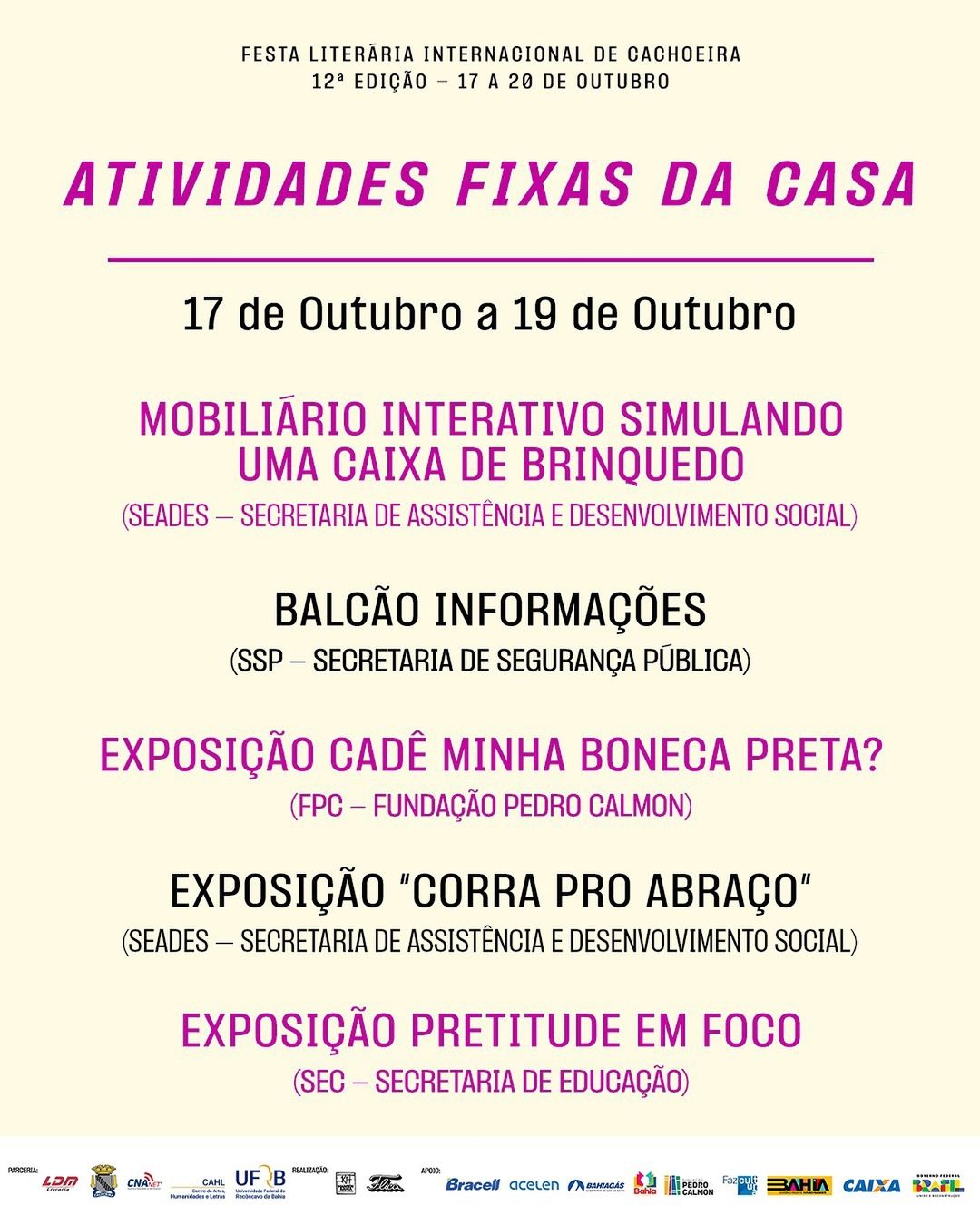 Como atividades fixas da Casa, teremos o Espaço SDE; Mobiliário Interativo que simula uma caixa de brinquedo (Seades); Balcão de Informações (SSP-BA); Exposição Cadê Minha Boneca Preta? (FPC/SecultBA); Exposição “Corra pro Abraço” Secretaria de Assistência e Desenvolvimento Social (Seades); Exposição Pretitude em Foco (SEC); Espaço EGBA; Espaço FPC; Espaço Setur; Espaço SPM; Espaço Sepromi; ESPAÇO SECTI FIO CRUZ.