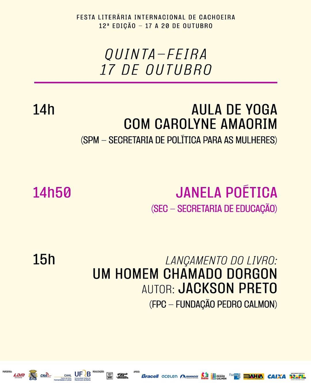 Ainda na quinta-feira (17), acontecem mais atividades da Janela Poética e da Secretaria de Cultura da Bahia, com Lançamento do Livro: Um homem chamado Dorgon, do autor Jackson Preto, realizado pela Fundação Pedro Calmon, e oficina de Cultura da Infância, jogos teatrais e músicas populares promovido pelo Centro de Cultura Popular e Identitária. A dinâmica da Casa do Governo ainda abriga o Mezanino Cultural (SEC-BA) e a oficina de Heels Dance, com a professora Talita Lima, da Fundação Cultural (Funceb/SecultBA).