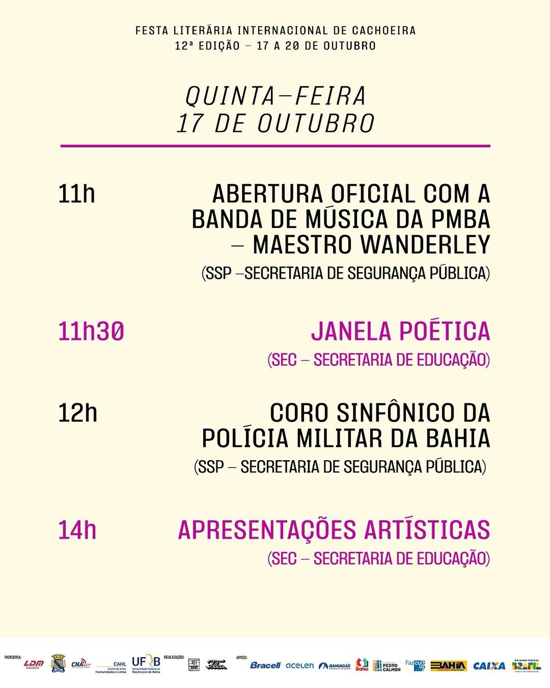 A abertura oficial, na quinta-feira (17), será realizada com apresentação musical da Banda de Música da PMBA, sob a regência do Maestro Wanderley, da Secretaria de Segurança Pública (SSP-BA), às 11h30. A programação segue com a Janela Poética da Secretaria de Educação (SEC-BA) e apresentação do Coro Sinfônico da Polícia Militar da Bahia.