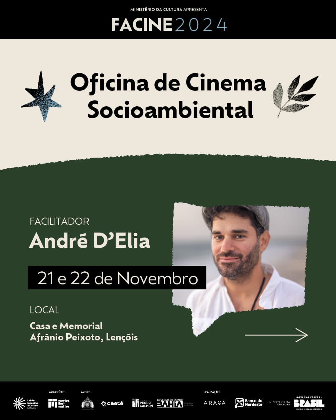 O Festival de Cinema Ambiental da Chapada Diamantina (Facine) tem o apoio da Fundação Pedro Calmon, unidade vinculada à Secretaria de Cultura da Bahia (SecultBA), para a realização do festival na Casa e Memorial Afrânio Peixoto, em Lençóis. O Facine vai oferecer 3 oficinas de cinema gratuitas. Uma delas, a Oficina de Cinema Socioambiental, facilitada pelo diretor de cinema André D´Elia, está com inscrições abertas até 31 de outubro, através do formulário. ACESSE!