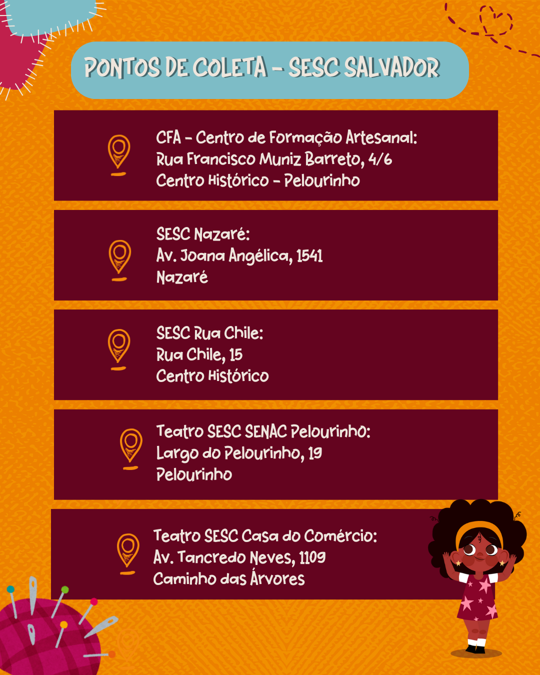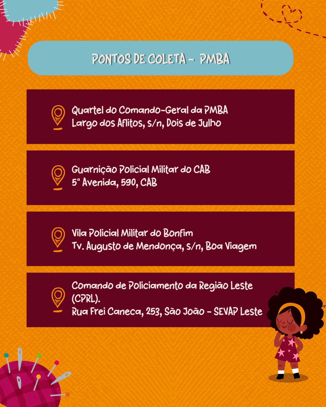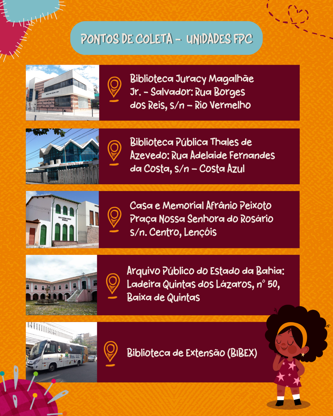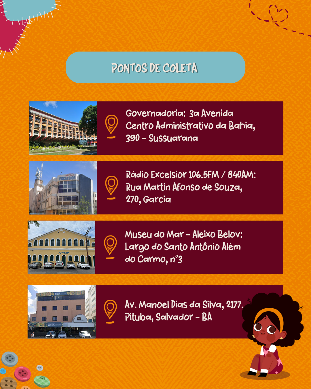 • 9h às 12h – Intervenções artísticas com personagens (Princesa Tiana, heroína Maria Felipa e super-herói Pantera Negra)