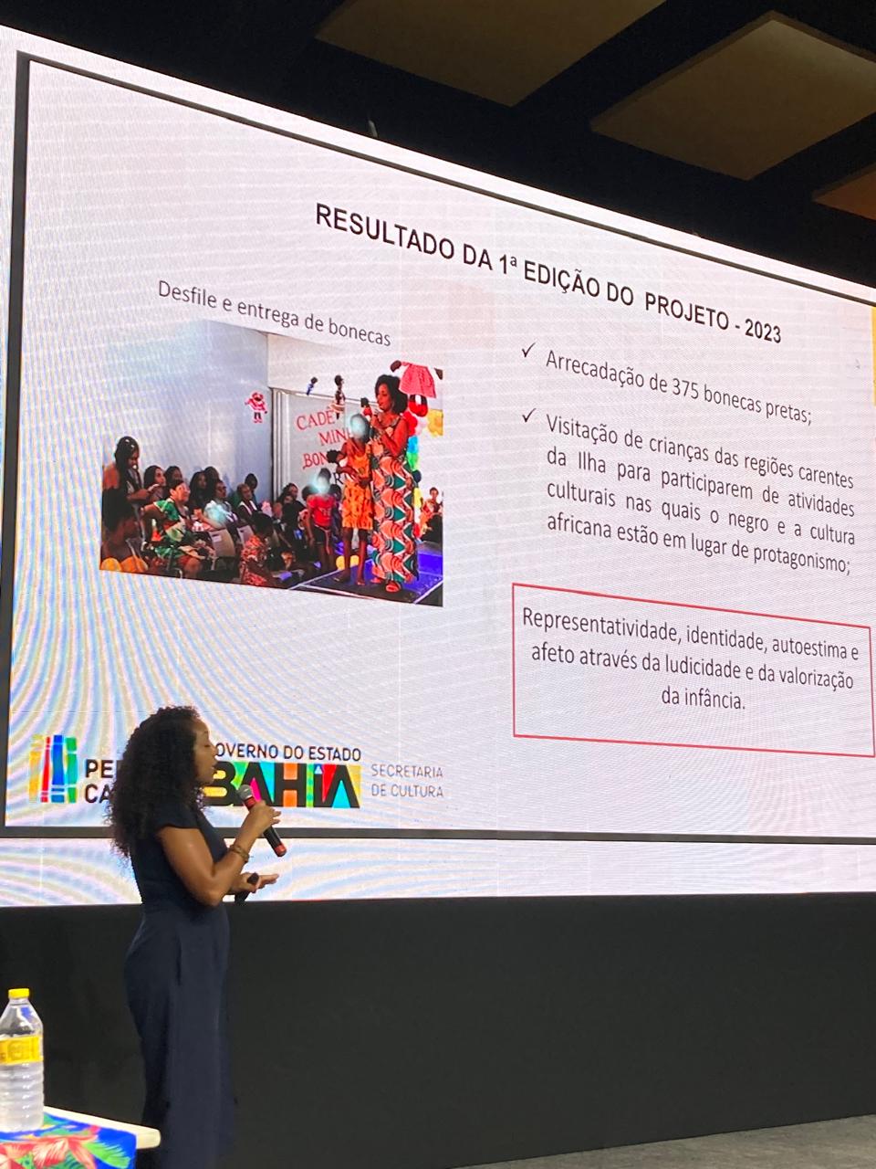 A gerente do Sistema Estadual de Bibliotecas Públicas da Bahia, Ingrid Paixão, apresentou as ações que vêm sendo desenvolvidas nas bibliotecas estaduais, as quais estão relacionadas à representatividade, leitura e literatura.