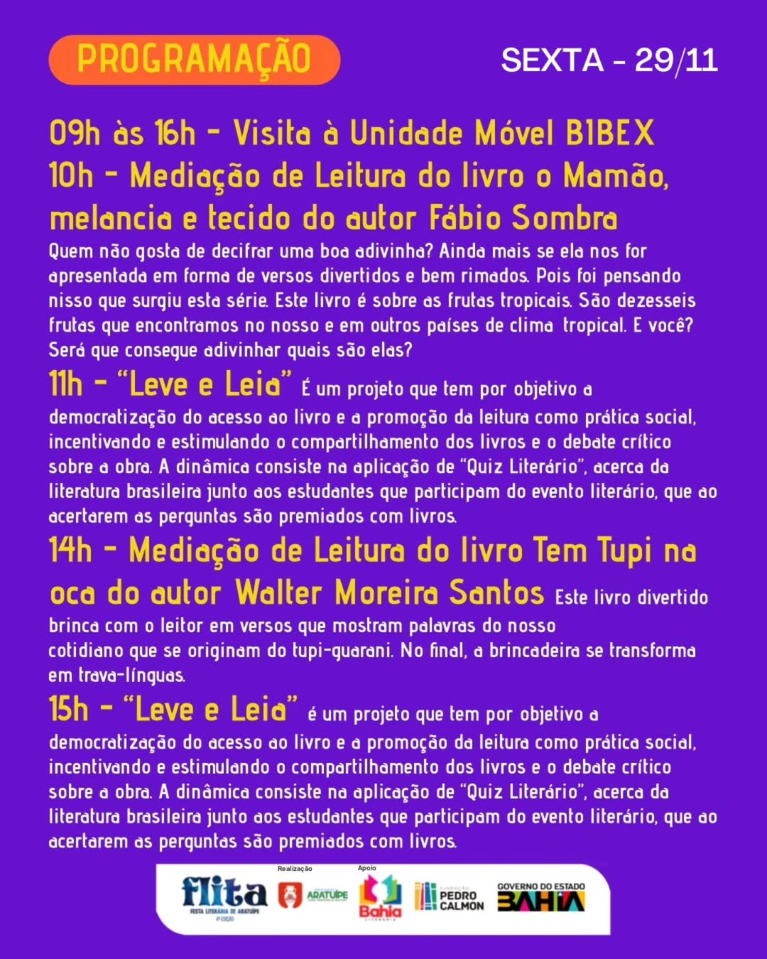A FLITA é uma realização da Prefeitura Municipal de Aratuípe com apoio do Governo do Estado, por meio da Bahia Literária, ação da Fundação Pedro Calmon, unidade vinculada à Secretaria de Cultura da Bahia.