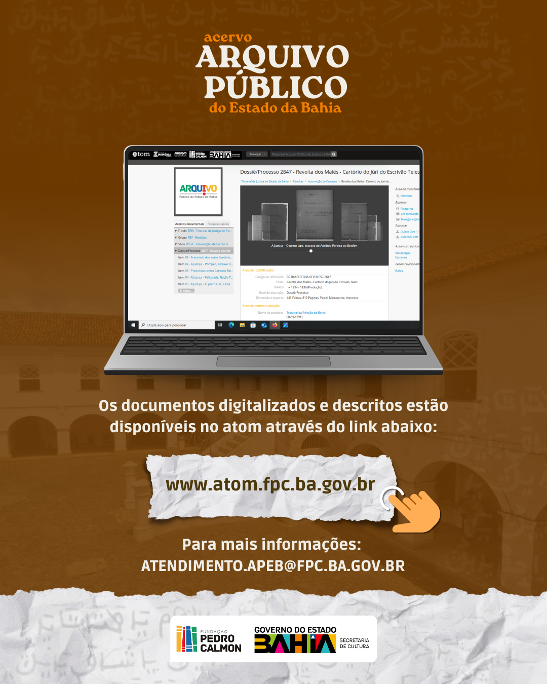 Está disponível no AtoM, acrônimo de “Acesso à Memória”, um software de fonte aberta, gratuito, para pesquisa, o conjunto documental constituído por seis maços de registros sobre a Revolta dos Malês. Os documentos são preservados e custodiados pelo Arquivo Público do Estado da Bahia (APEB), unidade da Fundação Pedro Calmon (FPC/SecultBA).