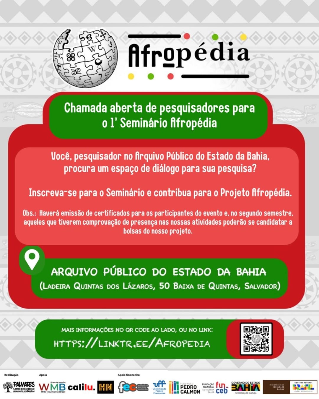 O projeto Afropédia: Conexões Ancestrais Ameaças e potencialidades na Internet para a Democracia, Direitos Humanos e o Enfrentamento ao Racismo, é uma iniciativa do Centro Palmares em parceria com a Fundação Euclides da Cunha e o Ministério da Igualdade Racial, com apoio financeiro do Governo da Bahia, por meio da Secretaria de Cultura da Bahia, através das unidades vinculadas Fundação Pedro Calmon e Fundação Cultural da Bahia.