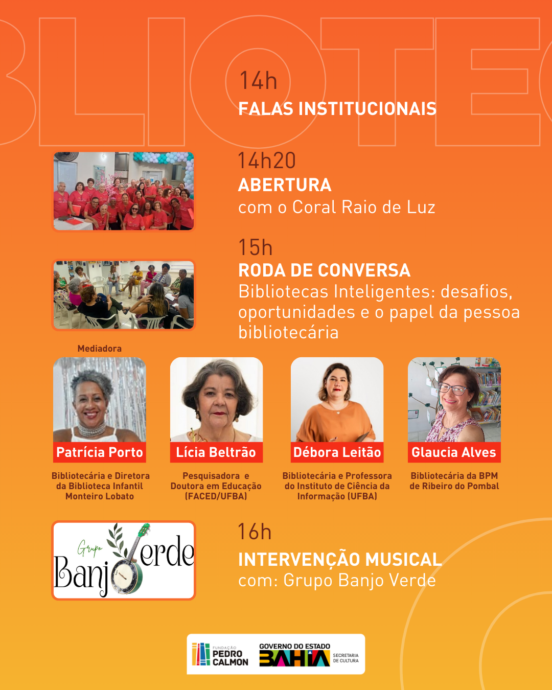 Com o tema "Bibliotecas Inteligentes: desafios, oportunidades e o papel da pessoa bibliotecária", a FPC promove programação no dia 09 de abril, a partir das 14h, com o Coral Raio de Luz; Mesa de Conversa com a presença da Professora do ICI/UFBA, Debora Leitão; da Doutora em Educação, Lícia Beltrão; da Bibliotecária da BPM de Ribeiro do Pombal, Glaucia Alves; Diretora da Biblioteca Infantil Monteiro Lobato, Patrícia Porto. O evento será finalizado com o samba do Grupo Musical Banjo Verde.