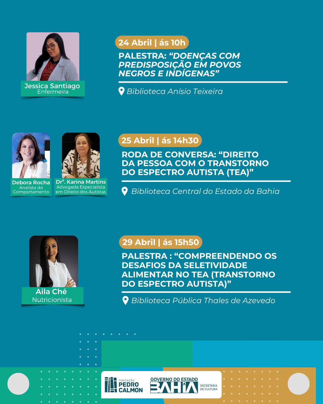 Logo em seguida, no dia 25 (sexta-feira), na Biblioteca Central do Estado da Bahia contará com a advogada especialista no dos direitos dos autistas, Drª. Karina Martins e a analista de comportamento, Debora Rocha para uma roda de conversa com objetivo de debater e conversar sobre os direitos das pessoas autistas e o que é o espectro autista, tirando dúvidas e explicando conceitos da atualidade.
