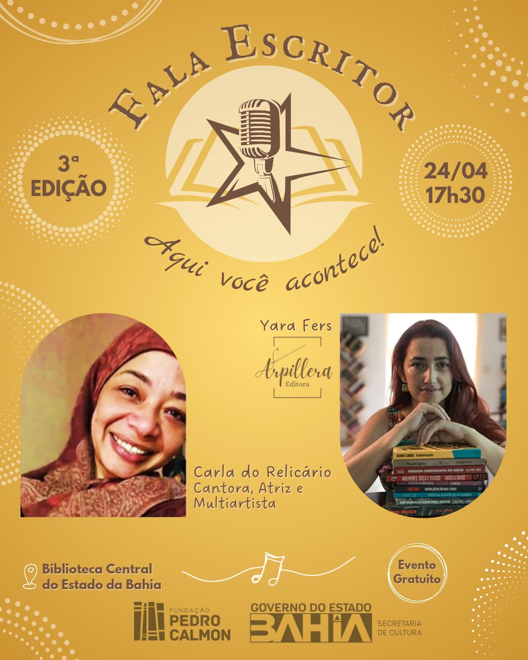A edição de abril do projeto Fala Escritor acontecerá no dia 24 de abril (quinta-feira), das 17h30 às 20h, na Biblioteca Central do Estado da Bahia, unidade da Fundação Pedro Calmon (FPC/SECULT-BA), localizada na Rua General Labatut, nº 27, nos Barris, em Salvador. A entrada é gratuita. Como nas edições anteriores, o evento busca valorizar a arte poética e a escrita criativa, sendo também um espaço de incentivo à leitura e à publicação de novos autores.