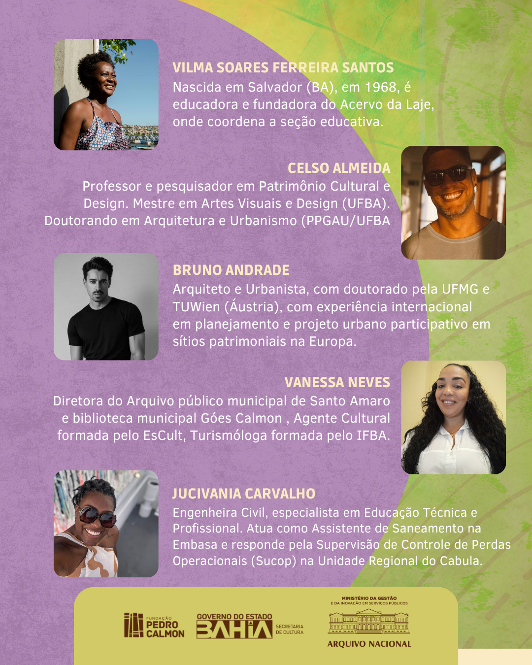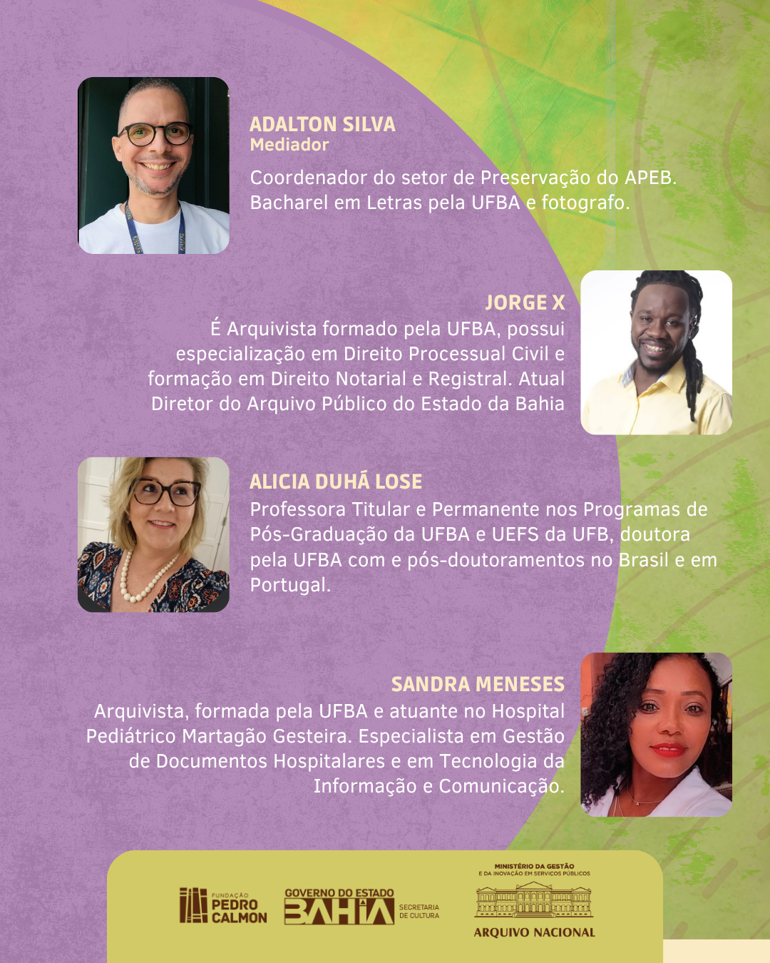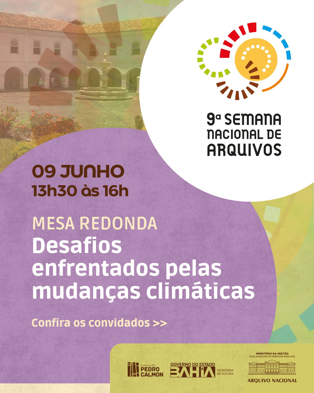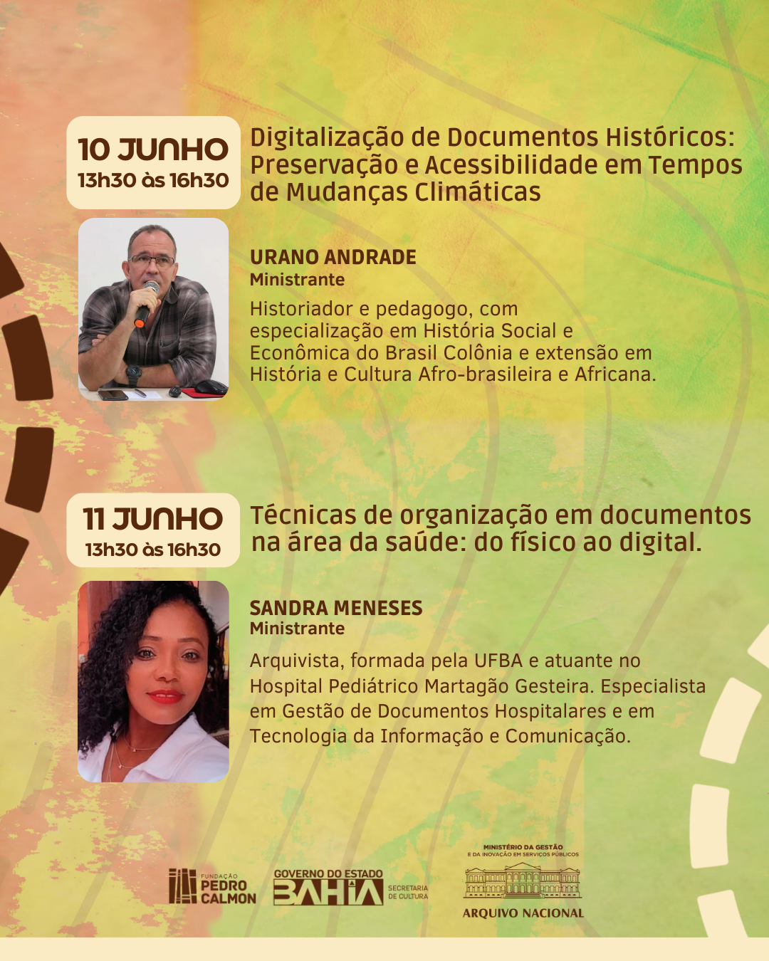 A programação no Arquivo Público do Estado da Bahia tem início na segunda-feira (9/6), com a Mesa-redonda sobre "Os desafios enfrentados pela mudança climática nas instituições públicas, OSCs e empresas privadas", às 13h30, com a participação de Jorge Vieira - Diretor do APEB; da Profª Drª Alicia Duhá Lose – Docente da UFBA, especialista em Paleografia; Sandra Menezes – Arquivista atuante no Hospital Pediátrico Martagão Gesteira; Vilma Santos - Educadora e fundadora do Acervo da Laje; do Prof. Dr. e pesquisador em Patrimônio Cultural e Design, Celso Almeida; do Dr. em Arquitetura e Urbanismo, pesquisador de Pós-Doutorado do Grupo EtniCidades – Bruno Andrade; da Diretora do Arquivo Público Municipal de Santo Amaro e Biblioteca Municipal Góes Calmon – Vanessa Neves e da Engenheira Civil e Supervisora de Controle de Perdas Operacionais – Sucop, na Unidade Regional do Cabula, Jucivânia Carvalho.