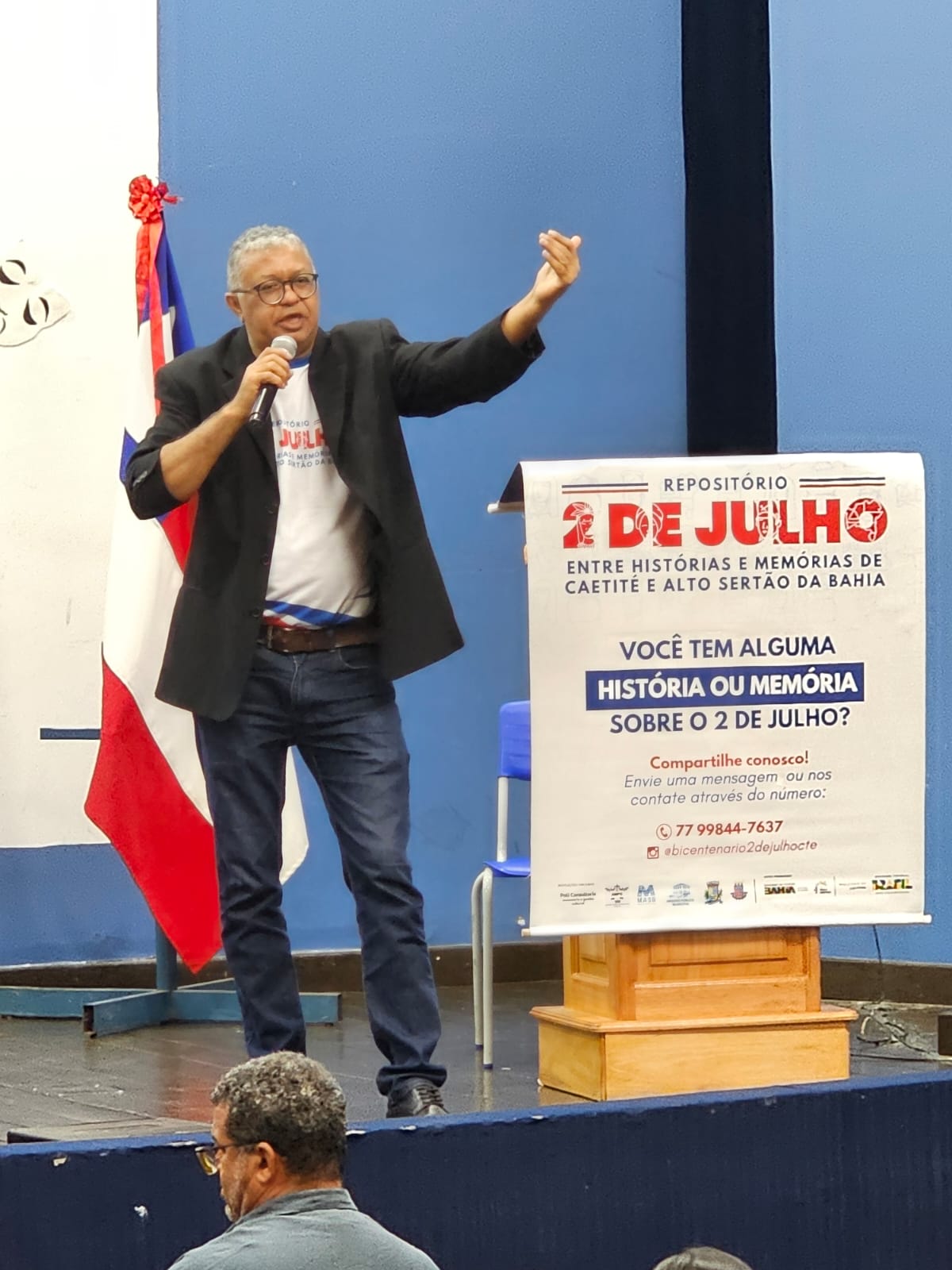 Na sequência das atividades da manhã, aconteceu a aula pública do professor Zezito Rodrigues, que discutiu a importância da Independência do Brasil na Bahia, seus desdobramentos, contextos históricos e personagens marcantes, destacando também as cidades com envolvimento no processo, como em Caetité, município que fica localizado no Alto Sertão, interior da Bahia. Seu nome deriva da língua tupi, uma junção dos termos ka’a (mata), itá (pedra) e eté (verdadeiro), que significa “mata da pedra grande”. É uma referência à formação rochosa a leste da cidade conhecida por “Pedra Redonda”. A cidade de Caetité tem uma importância significativa para a Independência da Bahia. Era um local estratégico no interior do Estado na luta contra os portugueses, a cidade marcou a história, porque além de apoiar Cachoeira, forneceu munições, homens e alimentos como, por exemplo, carne seca, para os participantes das lutas em outras cidades do Recôncavo. O que a tornou um caminho indispensável para os grupos aliados à causa do Brasil.