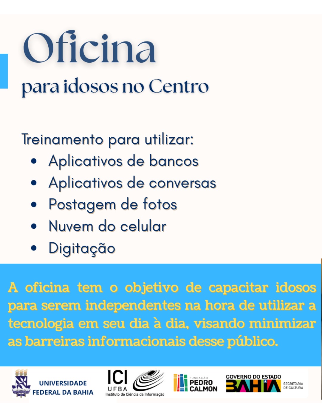 Apresentação introdutória sobre o uso da tecnologia no cotidiano, seguida de um momento interativo de atendimento individualizado, essa é uma das ações do Biblio Conexão, uma oficina de capacitação para idosos, que irá acontecer na Biblioteca Anísio Teixeira, nesta sexta-feira (18), às 09h. A iniciativa é uma realização da Universidade Federal da Bahia (UFBA), Instituto de Ciência da Informação (ICI), em parceria com a Fundação Pedro Calmon (FPC/SecultBA).