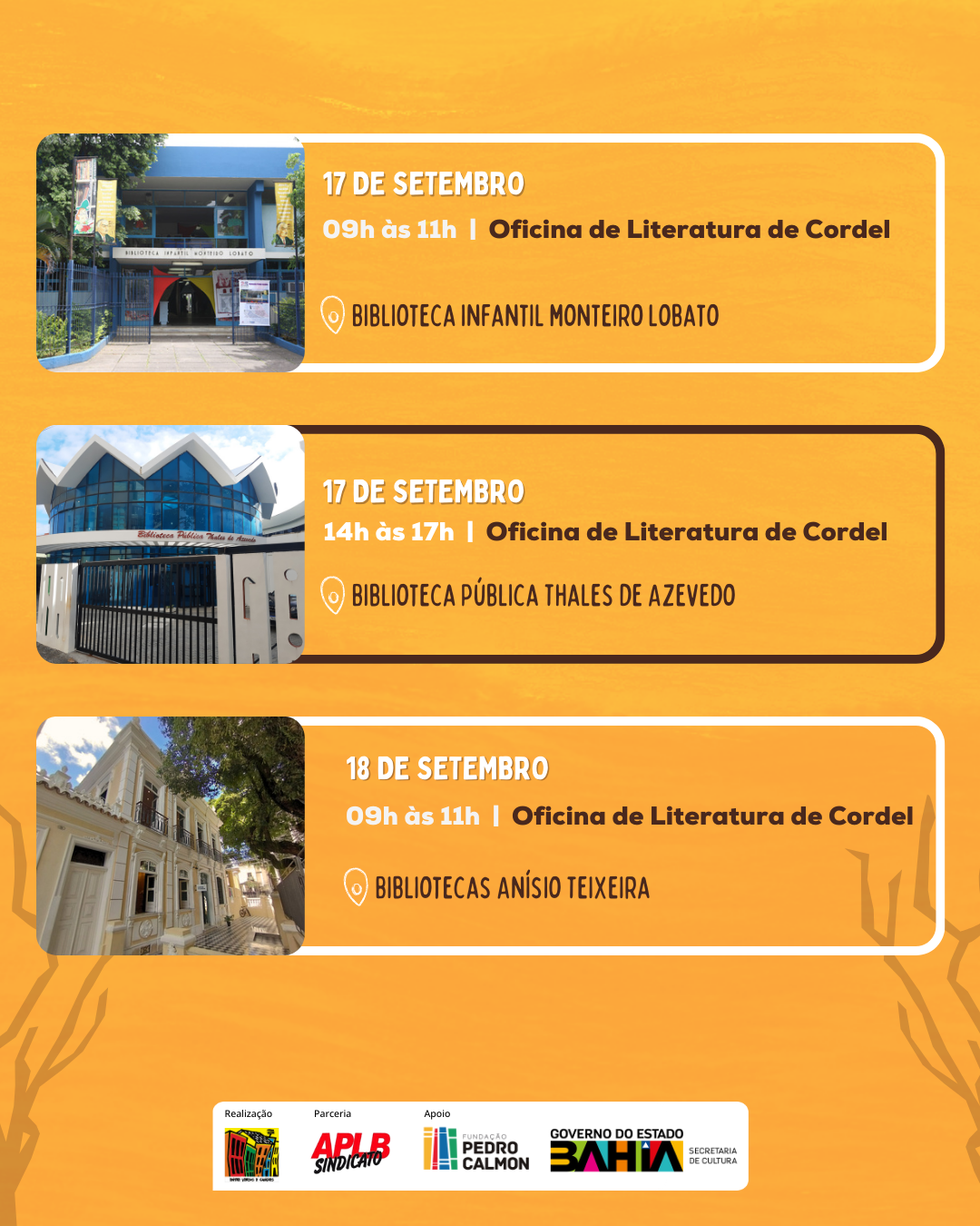 A programação itinerante passará por seis bibliotecas – Biblioteca Anísio Teixeira, Biblioteca Central do Estado da Bahia, Biblioteca Infantil Monteiro Lobato, Biblioteca Juracy Magalhães Jr. (Salvador e Itaparica) e a Biblioteca Thales de Azevedo – oferecendo momentos formativos e artísticos que incentivam a criação literária, a preservação da identidade cultural baiana e o fortalecimento da rede de leitura.