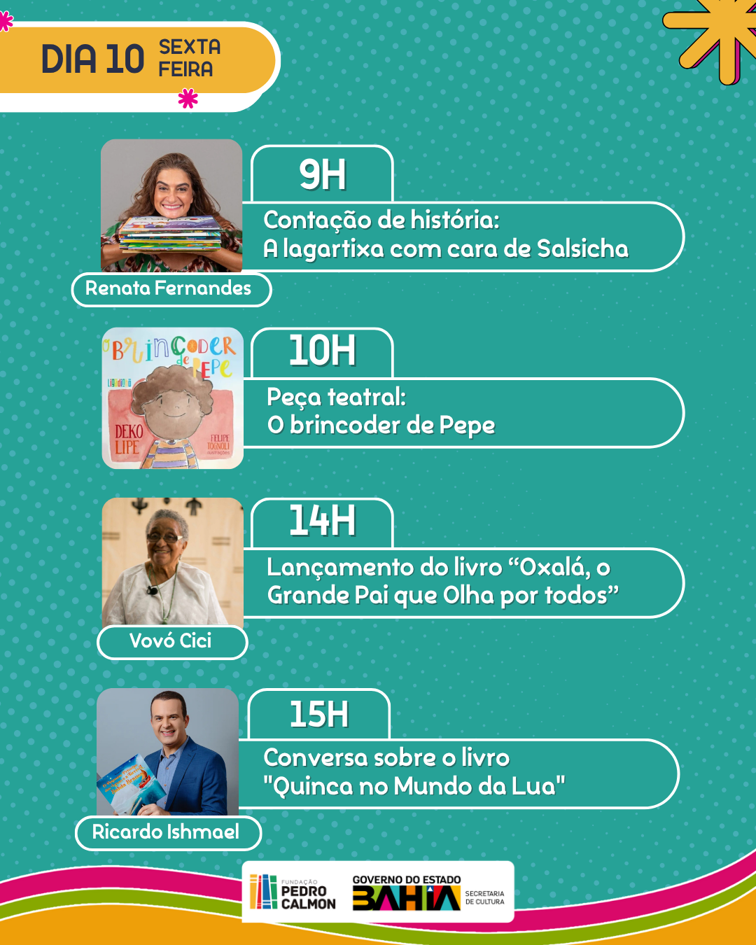 ‘Ler e Brincar’ acontece na Biblioteca Central do Estado da Bahia nos dias 09, 10 e 11 de outubro, com curadoria da escritora Emília Nuñez. A programação promoverá momentos especiais que aproximam os pequenos leitores da criação literária. O festival, que acontece em outubro, considerado o mês das crianças, presta homenagem a duas grandes referências da cultura e da educação no Brasil: Mabel Velloso e Lydia Hortélio, mulheres que dedicaram suas vidas a valorizar a palavra, a música, as cantigas e a memória da infância.