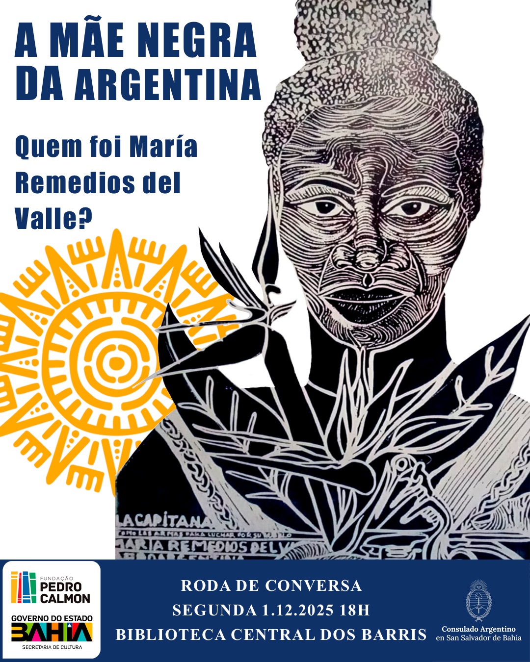 A Mãe Negra da Argentina: a história de Maria Remedios del Valle, que lutou na guerra contra o domínio espanhol em seu país, ao lado do marido e dos filhos, será celebrada em evento promovido pela Fundação Pedro Calmon, unidade vinculada à Secretaria de Cultura da Bahia e o Consulado da Argentina. A atividade acontecerá no dia 01 de dezembro, às 18h, na Biblioteca Central do Estado da Bahia, em Salvador.