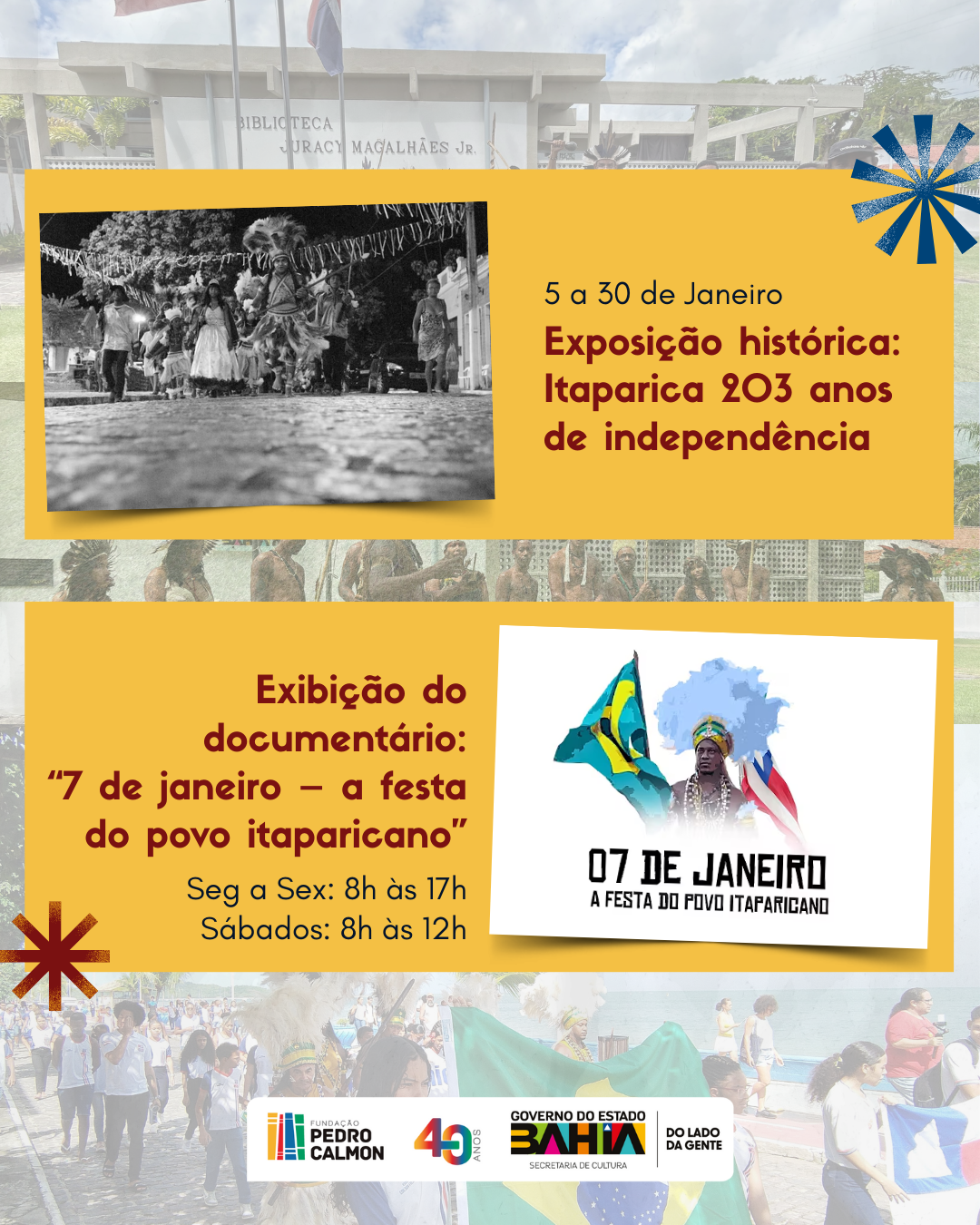 Uma das datas mais emblemáticas do calendário cívico baiano, o 7 de janeiro de 1823, ganha destaque neste mês de janeiro com uma programação especial promovida pela Fundação Pedro Calmon (FPC), unidade vinculada à Secretaria de Cultura da Bahia (SecultBA), na Biblioteca Juracy Magalhães Júnior de Itaparica (Rua Rui Barbosa, s/n – Centro Itaparica/BA).
