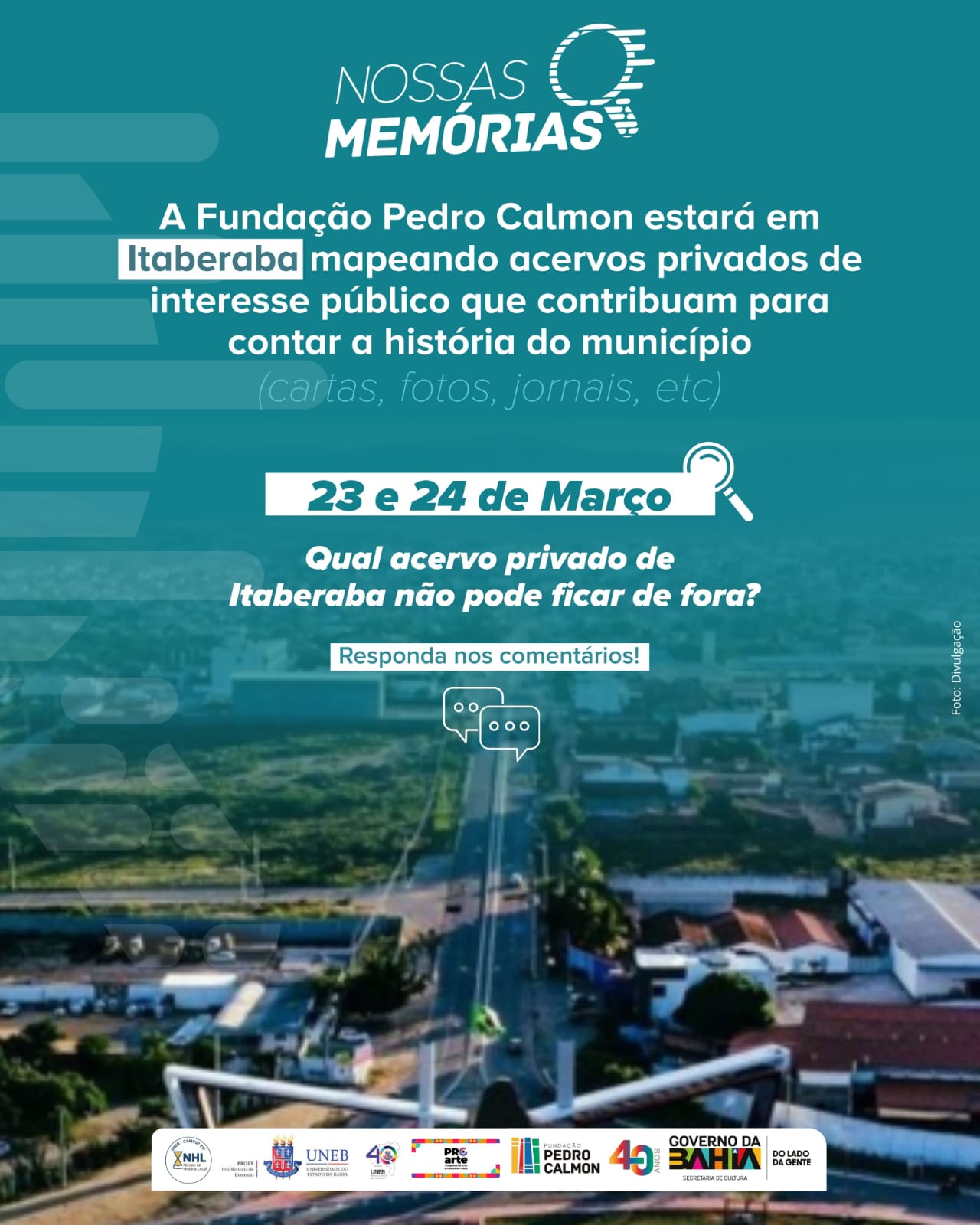 Itaberaba, no Território de Identidade Piemonte do Paraguaçu, receberá o projeto Nossas Memórias nos dias 23 e 24 de março. A iniciativa do Centro de Memória da Bahia, unidade da Fundação Pedro Calmon (FPC/SecultBA), em parceria com a UNEB - Campus XIII, promoverá uma mesa-redonda e o mapeamento de acervos privados de interesse público e social na cidade.