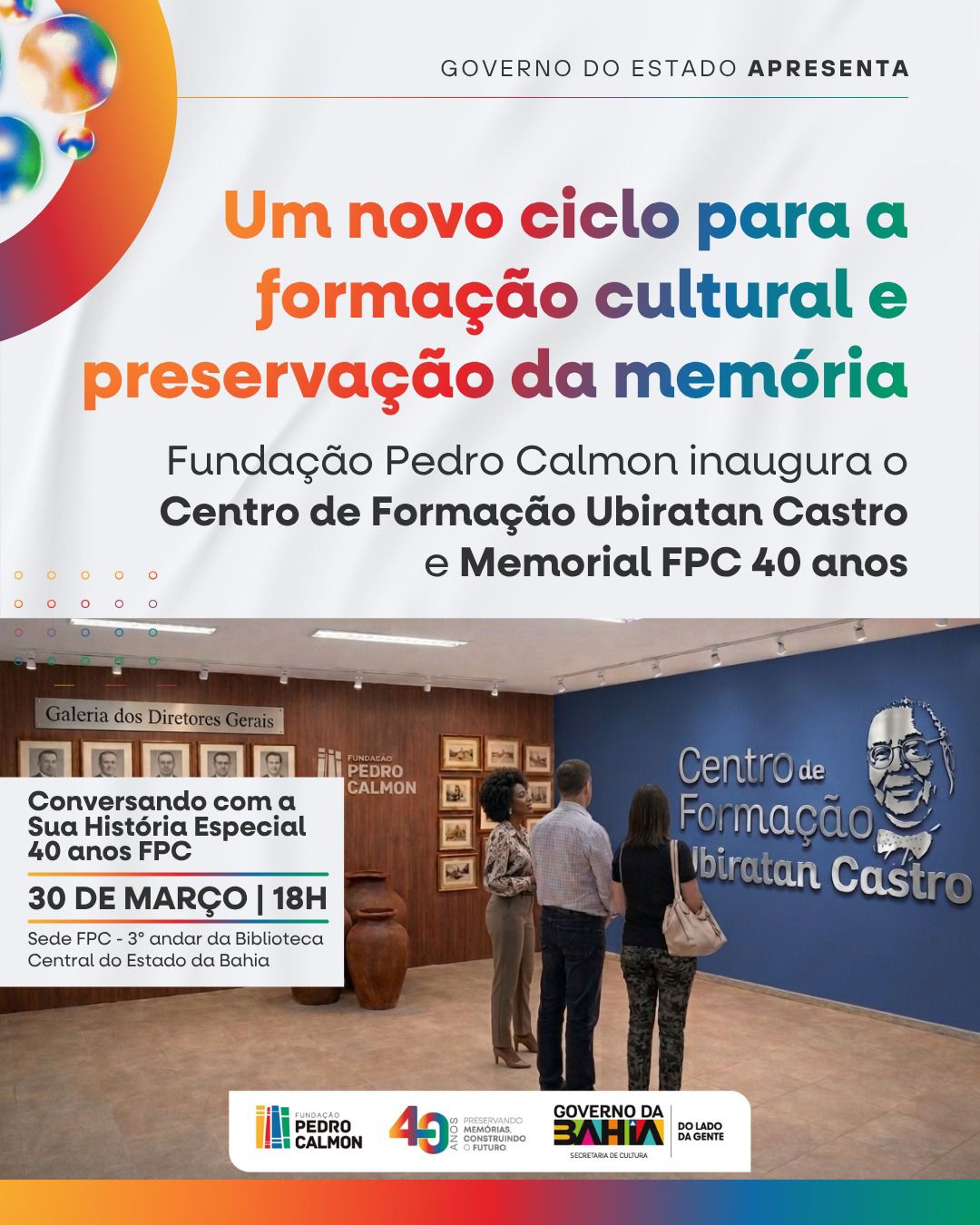 O dia 30 de março de 2026 marca a inauguração do Centro de Formação Ubiratan Castro e do Memorial FPC 40 anos, na Biblioteca Central do Estado da Bahia, em Salvador. A iniciativa integra as comemorações pelos 40 anos da Fundação Pedro Calmon (FPC), vinculada à Secretaria de Cultura do Estado da Bahia.