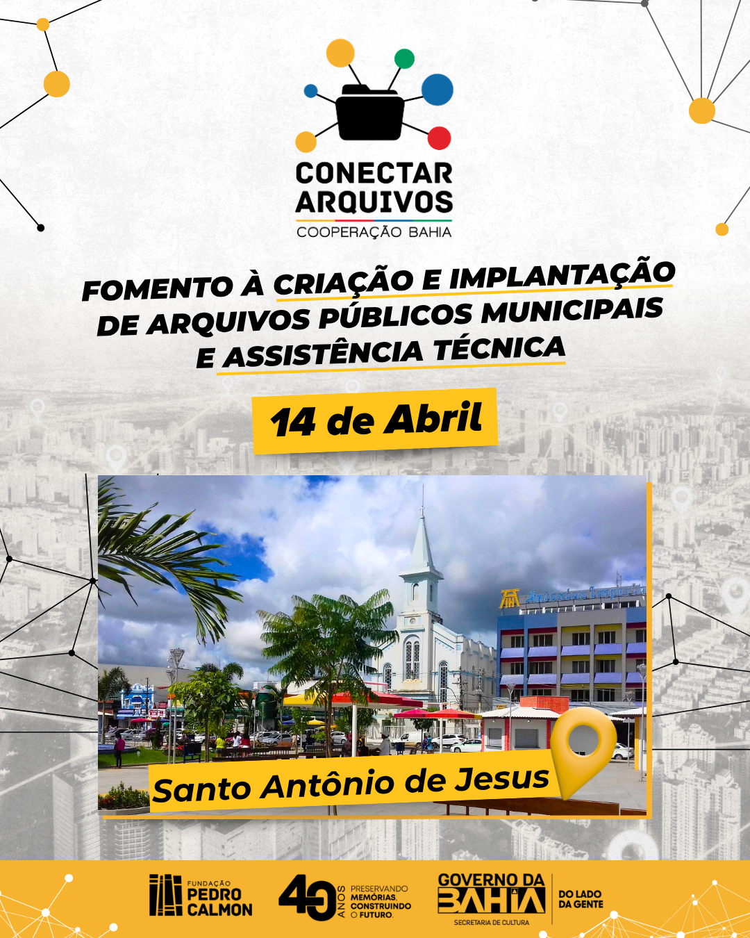 Entre os dias 14 de abril e 16 de junho, o programa Conectar Arquivos realiza uma série de ações estratégicas nos municípios de Santo Antônio de Jesus, Feira de Santana e Santo Estêvão, com o objetivo de fortalecer a gestão documental e fomentar a estruturação dos arquivos públicos municipais.