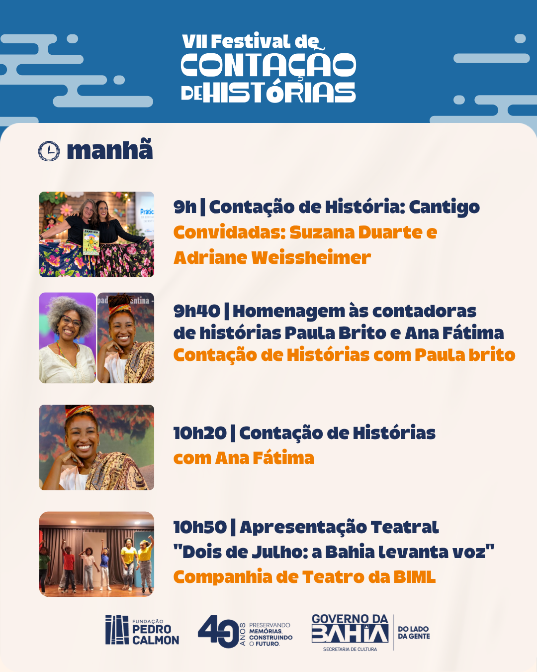 A programação contempla atividades ao longo de todo o dia, incluindo contações de histórias, homenagens, encontros com autores e apresentações culturais. Entre os destaques da manhã estão as participações de Suzana Duarte e Adriane Weissheimer, além da homenagem às contadoras Paula Brito e Ana Fátima. O público também poderá assistir à apresentação teatral “Dois de Julho: a Bahia levanta a voz”, da Companhia de Teatro da BIML.