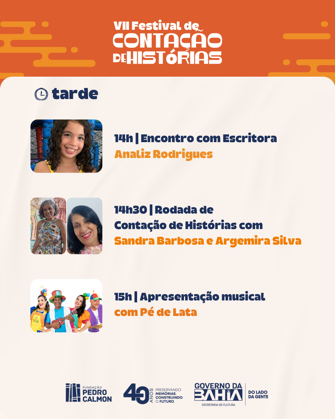 No período da tarde, a escritora mirim Analiz Rodrigues participa de um encontro com o público, seguida de uma rodada de contação de histórias com Sandra Barbosa e Argemira Silva. Encerrando a programação, o grupo Pé de Lata realiza uma apresentação musical voltada para o público infantil.