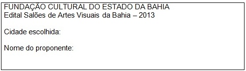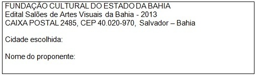 7.2 A documentação para a Habilitação deve ser entregue na COORDENAÇÃO DE ARTES VISUAIS FUNCEB – Rua Guedes de Brito nº 14 – Paço do Saldanha, Pelourinho, Salvador – BA, ou enviada via postal, apenas por serviço Sedex, com Aviso de Recebimento, para a CAIXA POSTAL 2485, CEP: 40.020-970, Salvador – Bahia. O envelope deverá conter as informações: Edital 05/2013 – SALÃO DE ARTES VISUAIS DA BAHIA– EDIÇÃO 2013, Nome do Proponente, Endereço e Título da Proposta. A FUNCEB fornecerá um comprovante de entrega e, no caso de correspondências enviadas por via postal, o Aviso de Recebimento (A.R) servirá como comprovante.