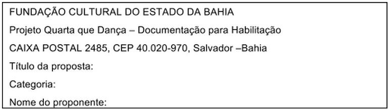 6.2 A documentação deve ser entregue presencialmente na Sede da Fundação Cultural do Estado da Bahia (Rua Guedes de Brito, nº14, Pelourinho), das 14h às 18h, na Coordenação de Dança ou enviada pelos Correios (somente por serviço Sedex com Aviso de Recebimento), atendendo o prazo previsto no item 6.1. O envelope com os documentos acima deverá apresentar as seguintes informações: