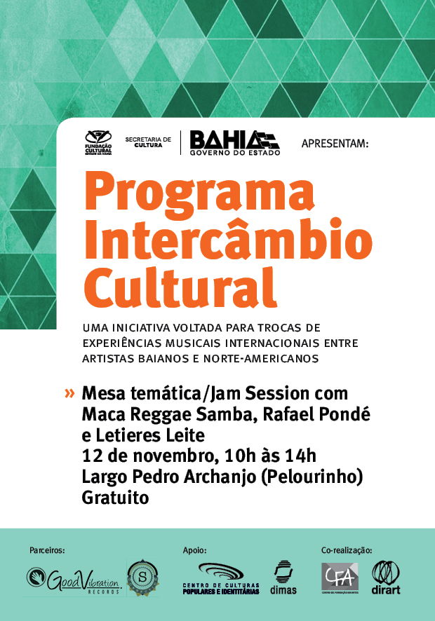 Uma iniciativa voltada para trocas de experiências musicais internacionais reunirá artistas baianos e norte-americanos em uma Mesa de Diálogos e Jam Session no Largo Pedro Arcanjo, no Pelourinho. O programa Intercâmbio Cultural, promovido pela Fundação Cultural do Estado da Bahia (FUNCEB), com apoio do Centro de Culturas Populares e Identitárias (CCPI), acontece nesta quinta-feira (12.11), das 10h às 14h. Na lista de atrações, os artistas baianos Rafael Pondé, Victor Souza, o Maestro Letieres Leite e seus alunos do CFA, a cantora Carissa Lawrence, o instrumentista Alex Crook (ambos norte-americanos) e a banda da Filadélfia e de Porto Rico De Tierra Caliente. A entrada é franca. A FUNCEB e o CCPI são entidades vinculadas à Secretaria de Cultura do Estado da Bahia (SeculBA).
