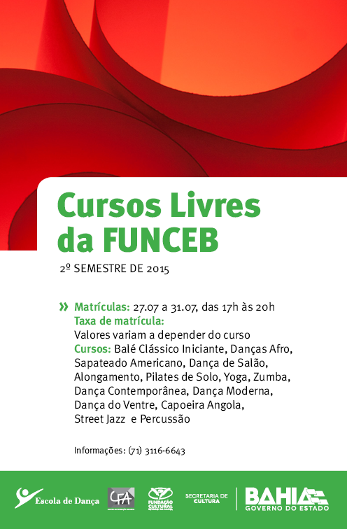 Iniciantes ou profissionais que desejam praticar e conhecer o universo da dança já podem se inscrever nos cursos livres da Escola de Dança integrada ao Centro de Formação em Artes (CFA) da Fundação Cultural do Estado da Bahia (FUNCEB), entidade vinculada à Secretaria de Cultura do Estado da Bahia (SecultBA). O período de inscrições é desta segunda-feira, 27.07 a 31.07 na Escola situada no Pelourinho. As aulas começam a partir de 03.08, sempre das 18h30 às 19h30 e das 19h30 às 20h30. Os valores de matrícula variam a depender do curso e as vagas são limitadas. Podem participar adultos a partir de 18 anos.