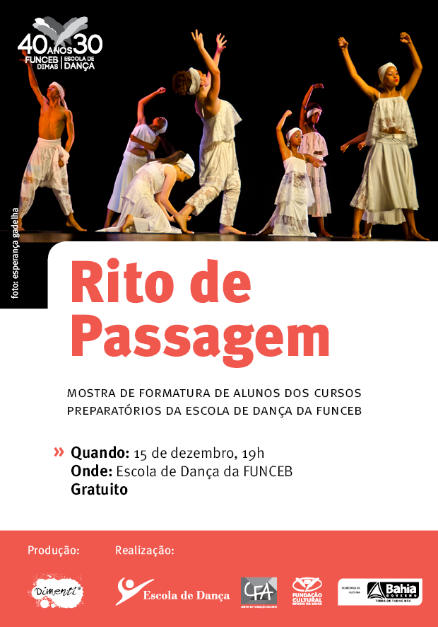 No dia 15 de dezembro, segunda-feira, às 19 horas, a Escola de Dança da FUNCEB vira palco para a mostra de dança Rito de Passagem. Na apresentação, alunos formandos encenam coreografias que marcam a conclusão do nível pré-profissional dos Cursos Preparatórios da Escola, unidade do Centro de Formação em Artes (CFA) da Fundação Cultural do Estado da Bahia (FUNCEB), entidade vinculada à Secretaria de Cultura do Estado da Bahia (SecultBA). O evento é mais uma ação das celebrações dos 30 anos da Escola de Dança da FUNCEB, fundada em 1984 como a primeira escola pública do gênero no Brasil. A entrada é franca.
