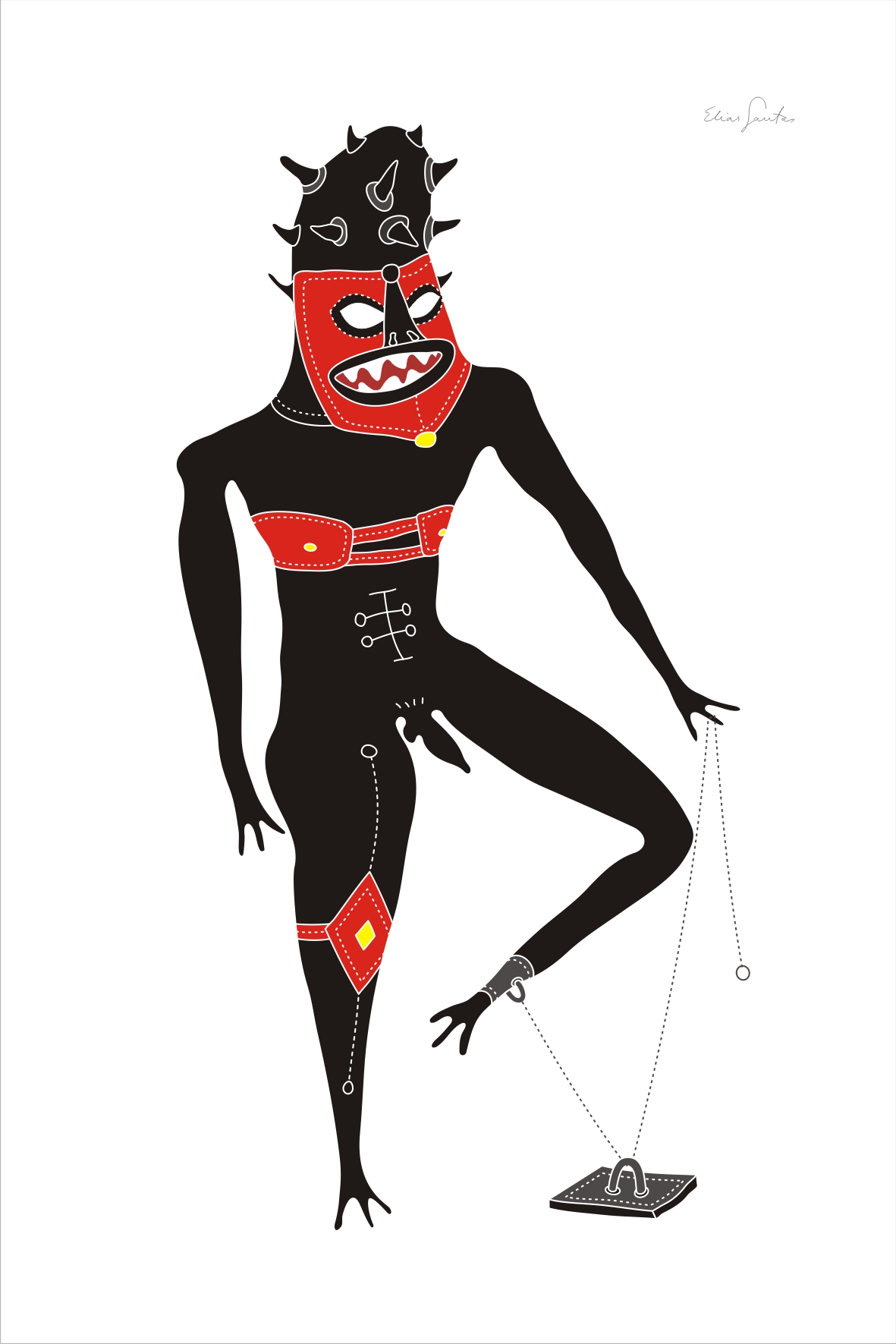 As dez gravuras reunidas foram impressas em papel fotográfico, com laminação fosca. Há ainda três telas em acrílico. No conjunto, elas vislumbram a possibilidade de trabalhar com a energia de Exu, orixá de caráter irreverente, provocador e sexual, com duas polaridades: negativa e positiva. Com essa noção de polos, foram criadas formas híbridas, hermafroditas, coexistência de tendências indefinidas que apontam para um contínuo de possibilidades existentes entre o masculino e o feminino. Ao reelaborar aspectos de uma religiosidade tão presente no corpo e no inconsciente, o artista dialoga com o passado utilizando a modernidade tecnológica.