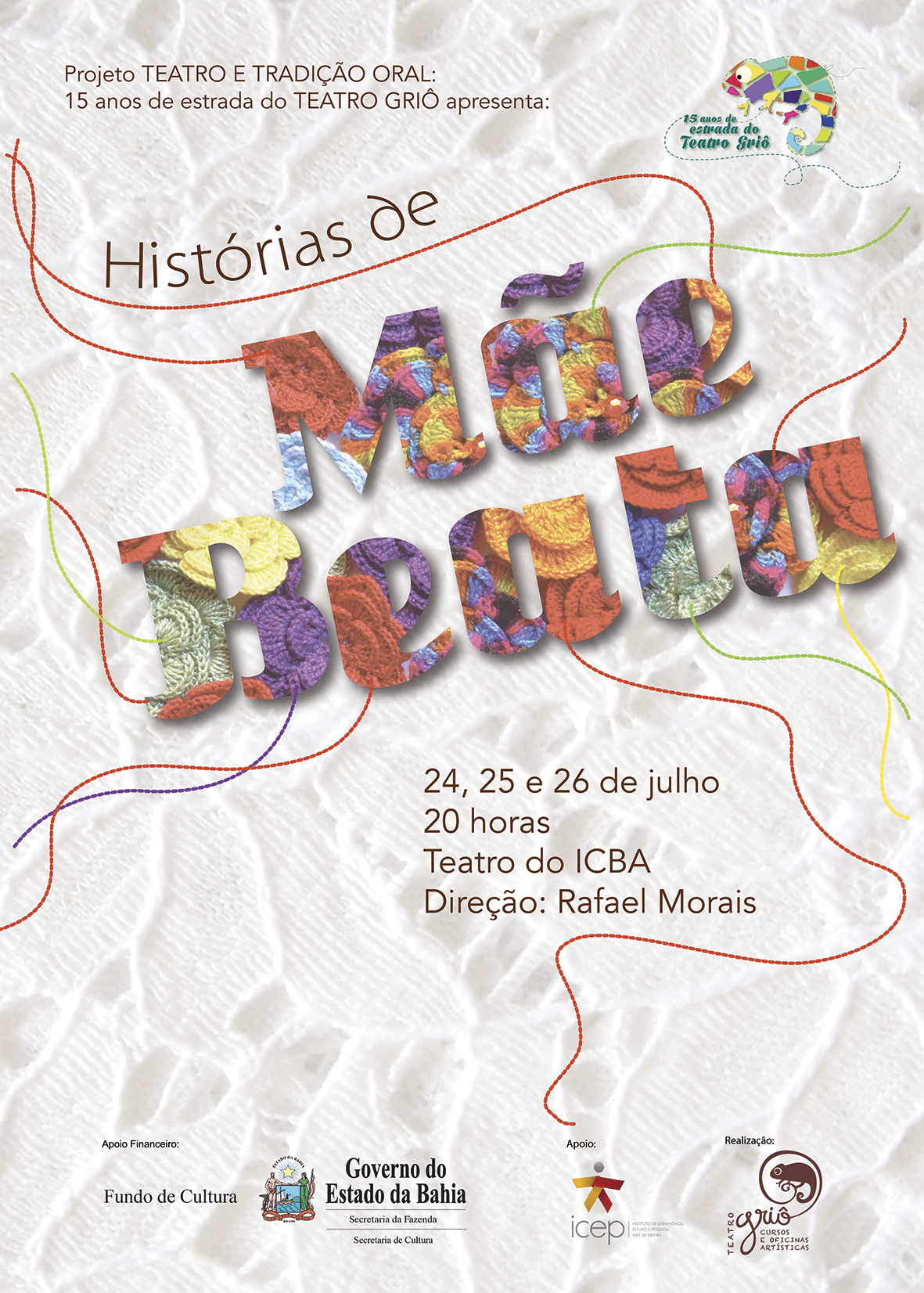 Ancestralidade e sabedoria popular são os fios condutores da montagem Histórias de Mãe Beata. As fábulas recheadas de magia trazem à cena os contos da Yalorixá de Cachoeira, Mãe Beata de Yemonjá, registrados no seu livro Caroço de Dendê. Nas tramas, sempre costuradas por músicas e danças, traduzem-se a vida e o encanto do Recôncavo Baiano, os mitos dos orixás e histórias de seres astutos e sagrados. A encenação de Rafael Morais faz uma imersão nos mitos e lendas narrados por Mãe Beata, inspirados pela tradição dos griots e da memória e cultura dos povos africanos. Com entrada franca, as apresentações desta curtíssima temporada de julho, nos dias 24, 25 e 26, às 20 horas, no Teatro do ICBA, fazem parte do projeto Teatro e Tradição Oral – 15 Anos de Estrada do Tetro Griô, apoiado pela Fundação Cultural do Estado da Bahia (FUNCEB), vinculada à Secretaria de Cultura do Governo do Estado da Bahia (SecultBA), através do Edital Setorial de Teatro, financiado pelo Fundo de Cultura (FCBA) e Secretaria da Fazenda (Sefaz).