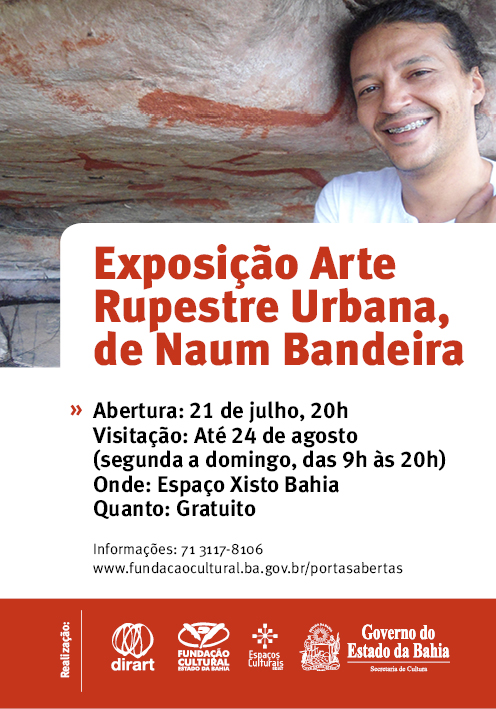 A exposição Arte Rupestre Urbana, do artista visual Naum Bandeira, será aberta na próxima segunda-feira, 21 de julho, às 20 horas, no Espaço Xisto Bahia, em Salvador. A mostra tem como temática a arte ancestral brasileira na contemporaneidade, especificamente da região da Chapada Diamantina, na Bahia. A visitação, que é gratuita, ficará aberta até o dia 24 de agosto, diariamente, das 9 às 20 horas. O projeto foi um dos selecionados do edital Portas Abertas para as Artes Visuais 2013, promovido pela Fundação Cultural do Estado da Bahia (FUNCEB), entidade vinculada à Secretaria de Cultura do Estado da Bahia (SecultBA), em parceria com a Superintendência de Desenvolvimento Territorial da Cultura (Sudecult), através de sua Diretoria de Espaços Culturais (DEC).