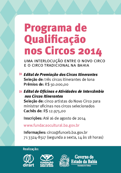 A Fundação Cultural do Estado da Bahia (FUNCEB), entidade vinculada à Secretaria de Cultura do Estado (SecultBA), lança o Programa de Qualificação nos Circos 2014, que reúne dois editais: o de Premiação dos Circos Itinerantes e o de Oficinas e Atividades de Intercâmbio nos Circos Itinerantes, ambos com inscrições até 16 de agosto. Em conjunto, os dois concursos promovem uma interlocução entre o Novo Circo e o Circo Tradicional na Bahia, selecionando três circos itinerantes de lona para receber, cada um, um aporte de R$ 50 mil, além da oportunidade de sediar ações formativas propostas por profissionais circenses atuantes no estado, dos quais cinco serão escolhidos. Os editais e seus anexos podem ser acessados no site da FUNCEB: www.fundacaocultural.ba.gov.br/qualificacaonoscircos2014.