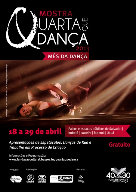 De 18 a 29 de abril, data em que se comemora o Dia Internacional da Dança, a Fundação Cultural do Estado da Bahia (FUNCEB), entidade vinculada à Secretaria de Cultura do Governo do Estado (SecultBA), promove a mostra Quarta que Dança 2013 – Mês da Dança 2014. A programação, que se estende por 12 dias consecutivos, com um total de 23 sessões gratuitas em Salvador, Ituberá, Juazeiro, Taperoá e Uauá, reúne espetáculos, danças de rua e trabalho em processo de criação. A temporada retoma apresentações da 15ª edição do projeto, consolidado como um dos principais mecanismos de promoção da Dança da Bahia.