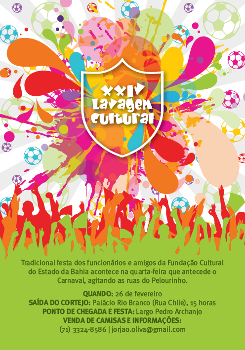 Origem – A primeira Lavagem Cultural aconteceu em 1989, quando a FUNCEB ainda funcionava na Biblioteca Pública, no bairro dos Barris. De lá para cá, a Lavagem prosseguiu apoiada pela comunidade, funcionários, familiares, convidados e celebridades como Ivete Sangalo, Regina Dourado, Daniela Mercury, Gil (ex-Banda Beijo), Carlinhos Brown, Armandinho, Elba Ramalho, Preta Gil, Licia Fabio, Tatau, Levi Lima e Ana Mametto. O evento já faz parte do calendário da Saltur e da Bahiatursa e reúne carros alegóricos, afoxés, funcionários, turistas e a população em geral. Hoje, a sede da FUNCEB está localizada Rua Guedes de Brito, 14 – Pelourinho.
