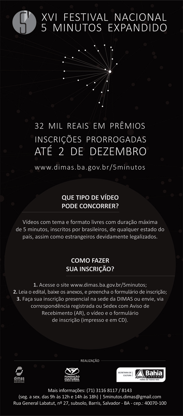 Termina no dia 2 de dezembro o prazo para as inscrições da 16ª edição do Festival Nacional 5 Minutos. Realizado pela Fundação Cultural do Estado da Bahia (FUNCEB), entidade vinculada à Secretaria de Cultura do Governo do Estado (SecultBA), através da sua Diretoria de Audiovisual (DIMAS), o concurso agora aberto visa à seleção de 50 vídeos com duração de até cinco minutos, de temática e estética livres, para integrar a Mostra Competitiva do evento, que distribuirá um total de R$ 32 mil em prêmios. O texto do edital, bem como seus anexos, pode ser consultado aqui.