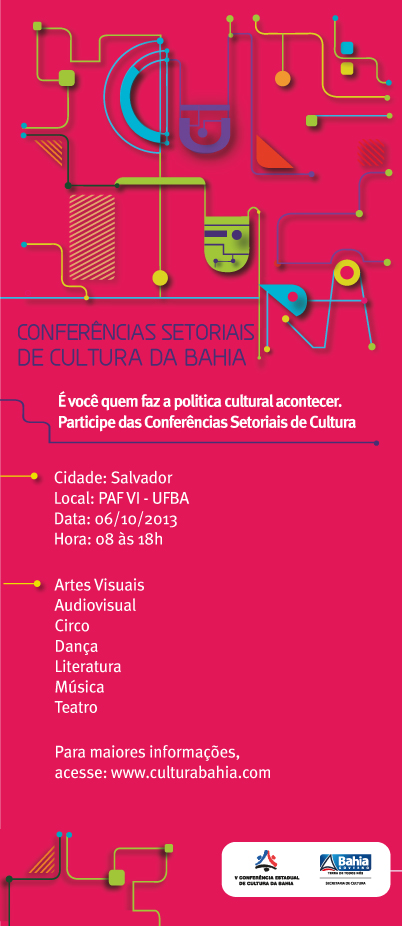 Depois de realizadas as etapas municipais, nas cidades baianas, e territoriais, nos 27 Territórios de Identidade do estado, é chegada a hora de debater a Cultura da Bahia sob um olhar setorial. No dia 6 de outubro (domingo), na Faculdade de Arquitetura e Urbanismo e no PAF VI da Universidade Federal da Bahia (Federação – Salvador), das 8 às 18 horas, 23 Conferências Setoriais de Cultura focam nas linguagens artísticas – Artes Visuais, Audiovisual, Circo, Dança, Literatura, Música e Teatro – e nas áreas de Arquivos, Memória e História; Bibliotecas; Culturas Afro-Brasileiras; Culturas da Infância; Culturas da Juventude; Culturas Digitais; Culturas dos Idosos; Mulher e Cultura; Culturas Indígenas; Culturas LGBT; Culturas Populares; Espaços Culturais; Estudos e Formação em Cultura; Livro e Leitura; Museus; e Serviços Criativos. O evento é aberto ao público e intenciona mobilizar uma expressiva participação da sociedade, representada por artistas, produtores, conselheiros, gestores, estudiosos, pesquisadores, investidores e demais protagonistas da Cultura.